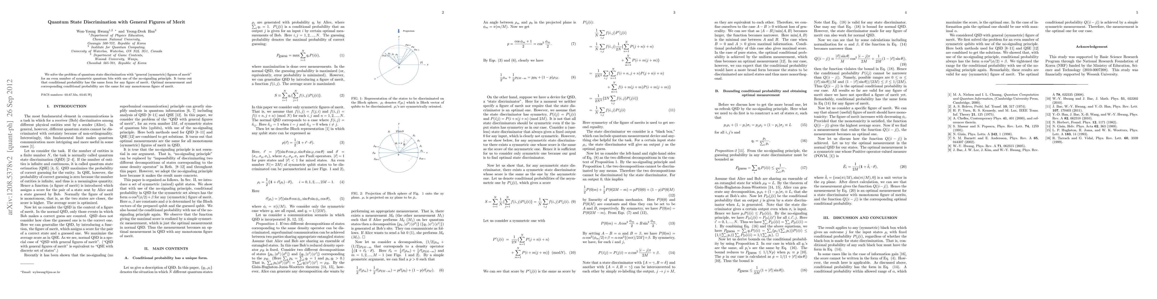 We solve the problem of quantum state discrimination with "general (symmetric) figures of merit" for an even number of symmetric quantum bits with use of the no-signaling principle. It turns out that conditional probability has the same form for any figure of merit. Optimal measurement and corresponding conditional probability are the same for any monotonous figure of merit.
