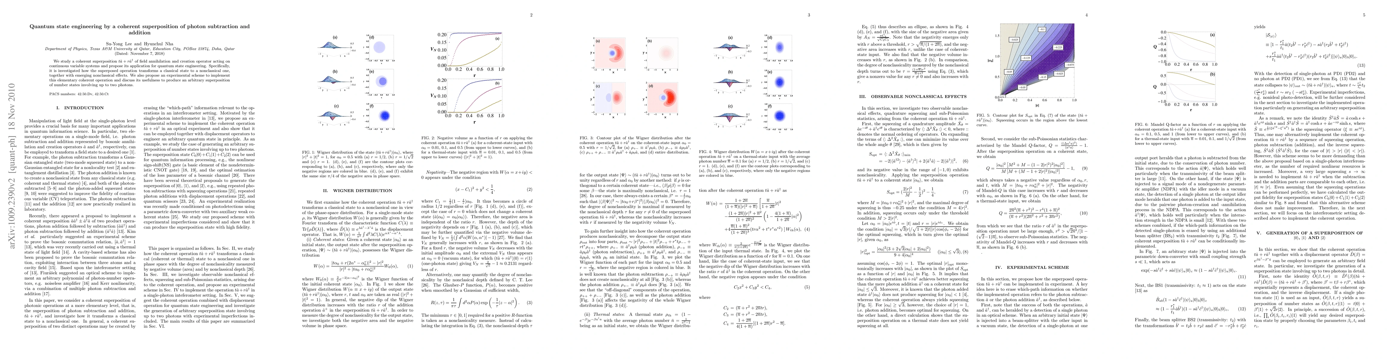 Summary: This paper explores the application of a coherent superposition of photon subtraction and addition operations on continuous variable systems for quantum state engineering. It investigates the transformation of classical states into nonclassical ones and proposes an experimental scheme to implement this operation for generating arbitrary superpositions of number states.