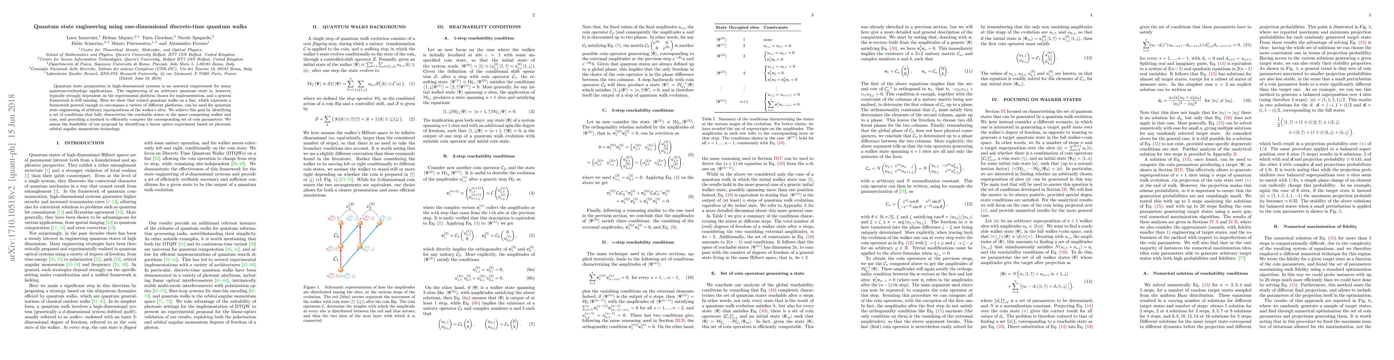 This paper proposes a method for quantum state engineering using one-dimensional discrete-time quantum walks, demonstrating that coined quantum walks can generate arbitrary superpositions of walker states across various platforms. The authors provide a framework to compute the necessary coin parameters and validate the approach with a photonic orbital angular momentum experiment.