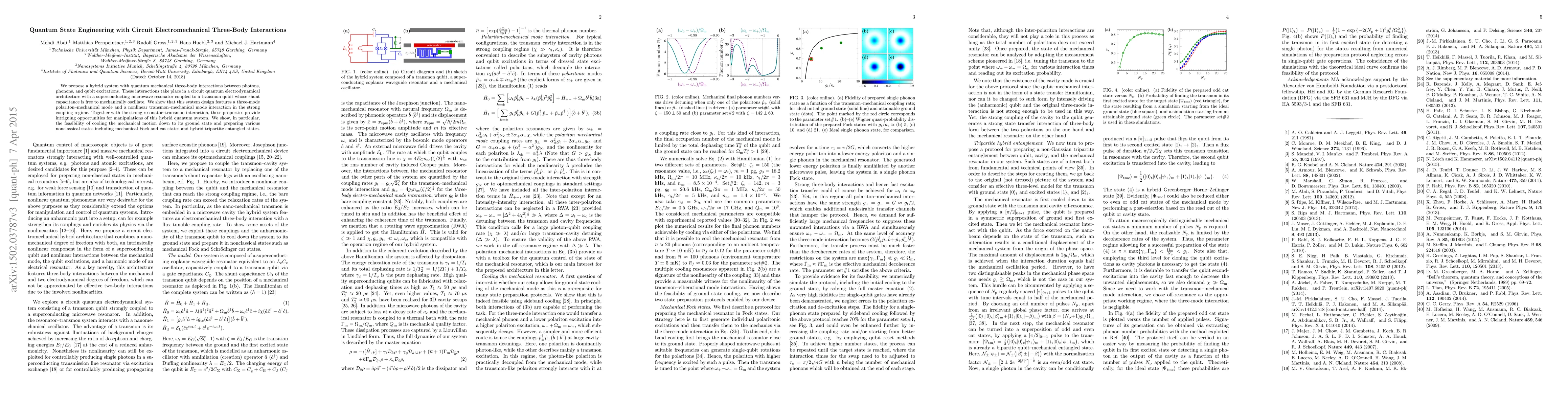 We propose a hybrid system with quantum mechanical three-body interactions between photons, phonons, and qubit excitations. These interactions take place in a circuit quantum electrodynamical architecture with a superconducting microwave resonator coupled to a transmon qubit whose shunt capacitance is free to mechanically oscillate. We show that this system design features a three-mode polariton--mechanical mode and a nonlinear transmon--mechanical mode interaction in the strong coupling regime. Together with the strong resonator--transmon interaction, these properties provide intriguing opportunities for manipulations of this hybrid quantum system. We show, in particular, the feasibility of cooling the mechanical motion down to its ground state and preparing various nonclassical states including mechanical Fock and cat states and hybrid tripartite entangled states.