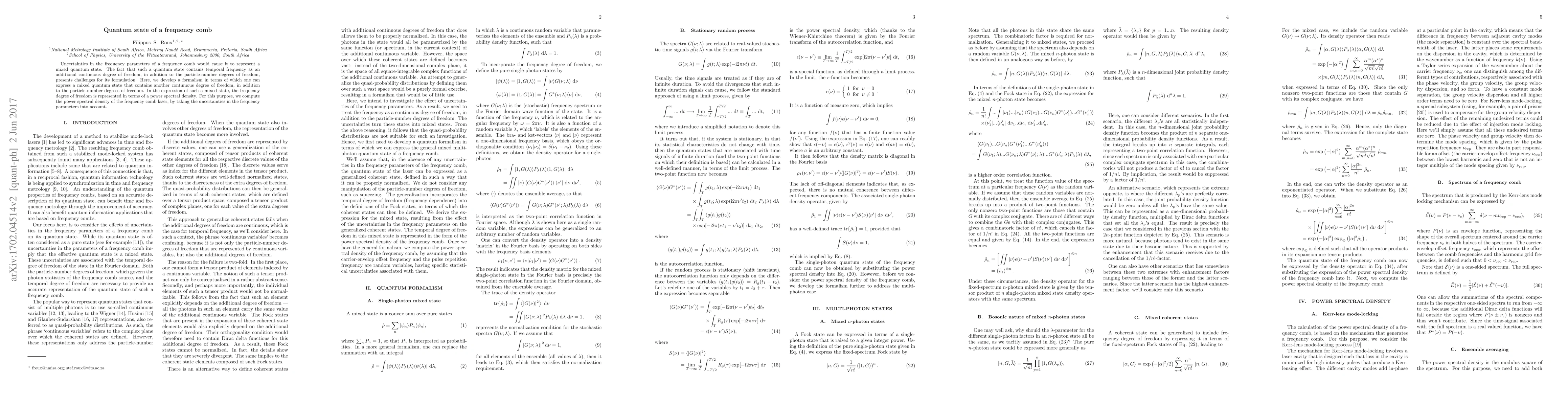 Uncertainties in the frequency parameters of a frequency comb laser, causes it to represent a mixed quantum state. The formulation of such a quantum state is compounded by the fact that it contains both particle-number degrees of freedom and temporal degrees of freedom. Here we develop a formalism in terms of which such a mixed quantum state can be expressed. For this purpose we also need to compute the expression for the power spectral density of the frequency comb laser. We do so by taking the uncertainties in the frequency parameters into account.