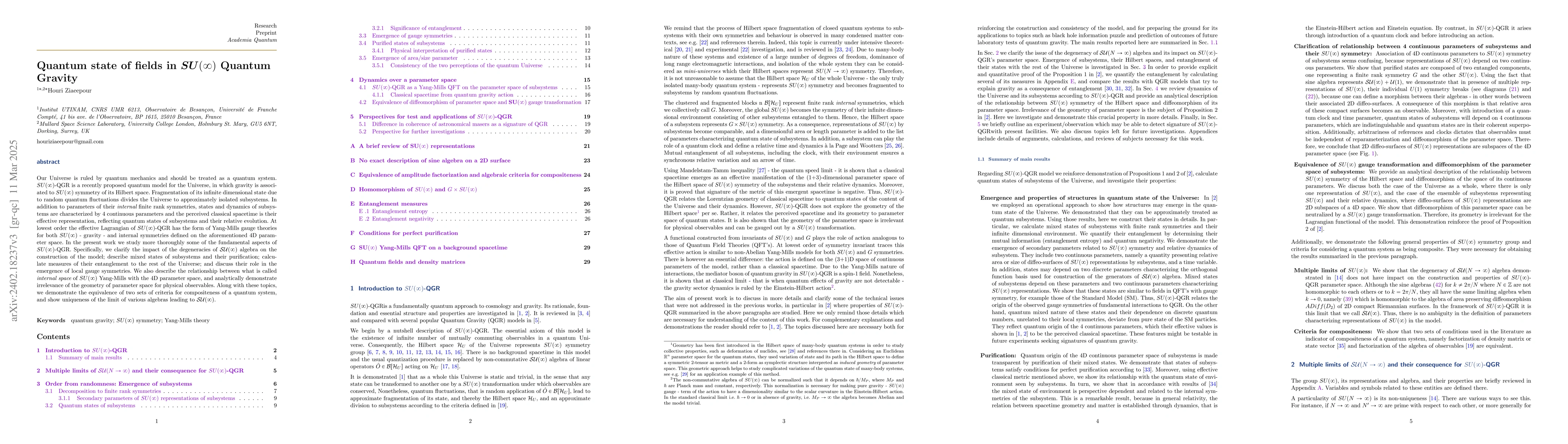 Our Universe is ruled by quantum mechanics and should be treated as a quantum system. $SU(\infty)$-QGR is a recently proposed quantum model for the Universe, in which gravity is associated to $SU(\infty)$ symmetry of its Hilbert space. Clustering of its infinite dimensional state due to random quantum fluctuations divides the Universe to approximately isolated subsystems. In addition to parameters of their internal finite rank symmetries, states and dynamics of subsystems are characterized by 4 continuous parameters, and the perceived classical spacetime is their effective representation, reflecting quantum states of subsystems and theirrelative evolution. At lowest order the effective Lagrangian of $SU(\infty)$-QGR has the form of Yang-Mills gauge theories for both $SU(\infty)$ - gravity - and internal symmetries defined on the aforementioned 4D parameter space. In the present work we study more thoroughly some of the fundamental aspects of $SU(\infty)$-QGR. Specifically, we clarify impact of the degeneracy of $\mathcal{SU}(\infty)$; describe mixed states of subsystems and their purification; calculate measures of their entanglement to the rest of the Universe; and discuss their role in the emergence of local gauge symmetries. We also describe the relationship between what is called internal space of $SU(\infty)$ Yang-Mills with the 4D parameter space, and analytically demonstrate irrelevance of the geometry parameter space for physical observables. Along with these topics, we demonstrate the equivalence of two sets of criteria for compositeness of a quantum system, and show uniqueness of the limit of various algebras leading to $SU(\infty)$.