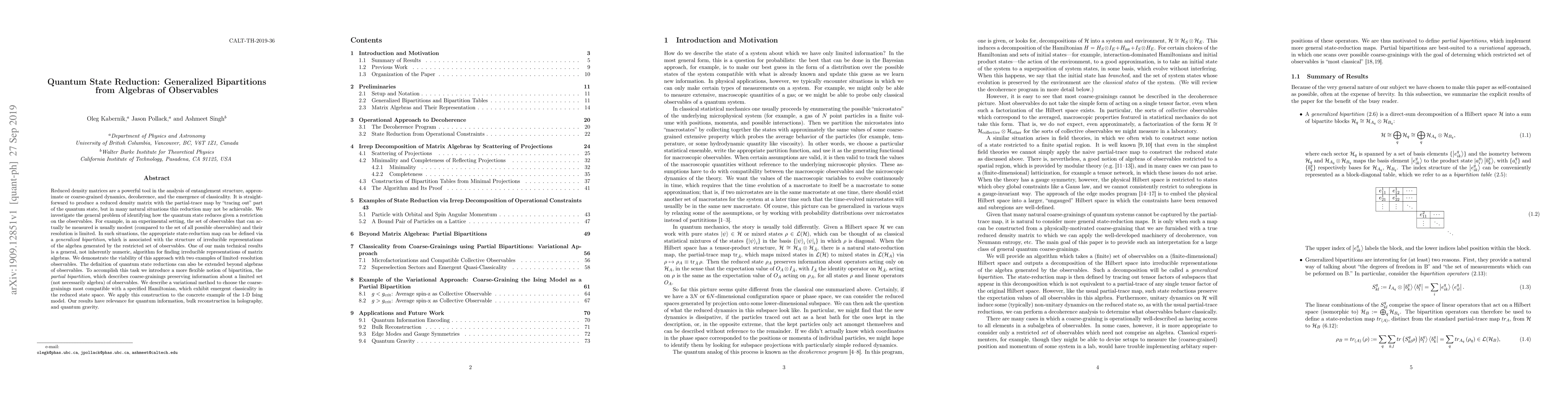 Reduced density matrices are a powerful tool in the analysis of entanglement structure, approximate or coarse-grained dynamics, decoherence, and the emergence of classicality. It is straightforward to produce a reduced density matrix with the partial-trace map by ``tracing out'' part of the quantum state, but in many natural situations this reduction may not be achievable. We investigate the general problem of identifying how the quantum state reduces given a restriction on the observables. For example, in an experimental setting, the set of observables that can actually be measured is usually modest (compared to the set of all possible observables) and their resolution is limited. In such situations, the appropriate state-reduction map can be defined via a generalized bipartition, which is associated with the structure of irreducible representations of the algebra generated by the restricted set of observables. One of our main technical results is a general, not inherently numeric, algorithm for finding irreducible representations of matrix algebras. We demonstrate the viability of this approach with two examples of limited--resolution observables. The definition of quantum state reductions can also be extended beyond algebras of observables. To accomplish this task we introduce a more flexible notion of bipartition, the partial bipartition, which describes coarse-grainings preserving information about a limited set (not necessarily algebra) of observables. We describe a variational method to choose the coarse-grainings most compatible with a specified Hamiltonian, which exhibit emergent classicality in the reduced state space. We apply this construction to the concrete example of the 1-D Ising model. Our results have relevance for quantum information, bulk reconstruction in holography, and quantum gravity.