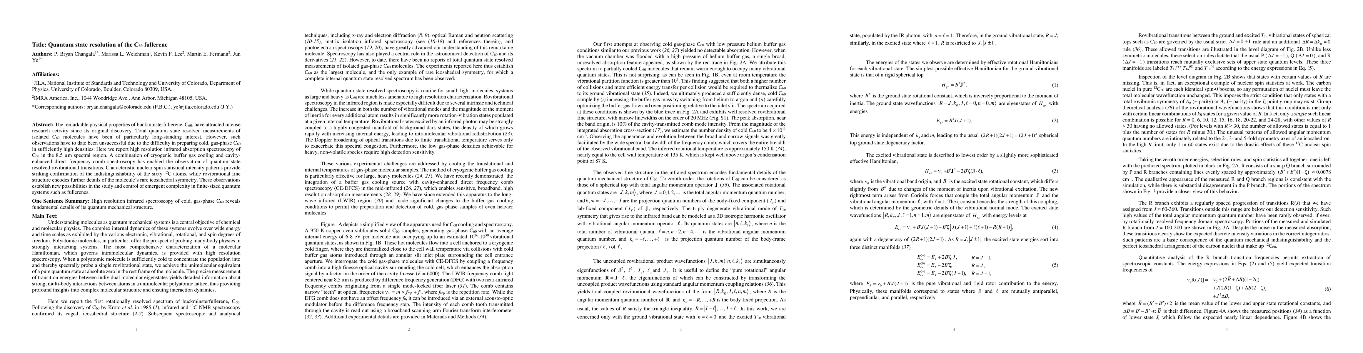 The remarkable physical properties of buckminsterfullerene, C$_{60}$, have attracted intense research activity since its original discovery. Total quantum state resolved measurements of isolated C$_{60}$ molecules have been of particularly long-standing interest. However, such observations have to date been unsuccessful due to the difficulty in preparing cold, gas-phase C$_{60}$ in sufficiently high densities. Here we report high resolution infrared absorption spectroscopy of C$_{60}$ in the 8.5 $\mu$m spectral region. A combination of cryogenic buffer gas cooling and cavity-enhanced direct frequency comb spectroscopy has enabled the observation of quantum state resolved rovibrational transitions. Characteristic nuclear spin statistical intensity patterns provide striking confirmation of the indistinguishability of the sixty $^{12}$C atoms, while rovibrational fine structure encodes further details of the molecule's rare icosahedral symmetry. These observations establish new possibilities in the study and control of emergent complexity in finite-sized quantum systems such as fullerenes.