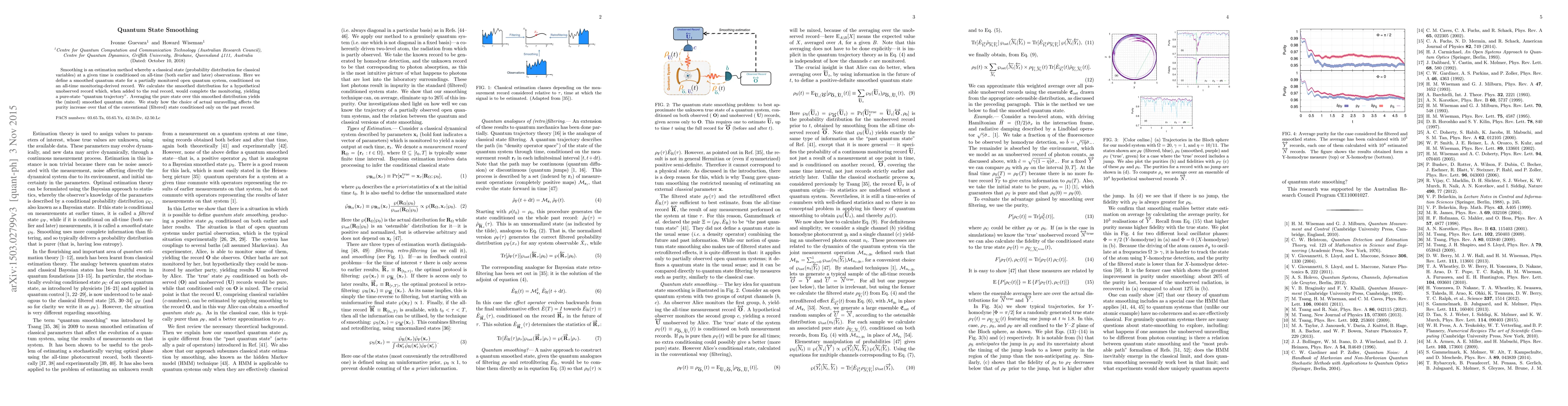 Smoothing is an estimation method whereby a classical state (probability distribution for classical variables) at a given time is conditioned on all-time (both past and future) observations. Here we define a smoothed quantum state for a partially monitored open quantum system, conditioned on an all-time monitoring-derived record. We calculate the smoothed distribution for a hypothetical unobserved record which, when added to the real record, would complete the monitoring, yielding a pure-state "quantum trajectory". Averaging the pure state over this smoothed distribution yields the (mixed) smoothed quantum state. We study how the choice of actual unravelling affects the purity increase over that of the conventional (filtered) state conditioned only on the past record.