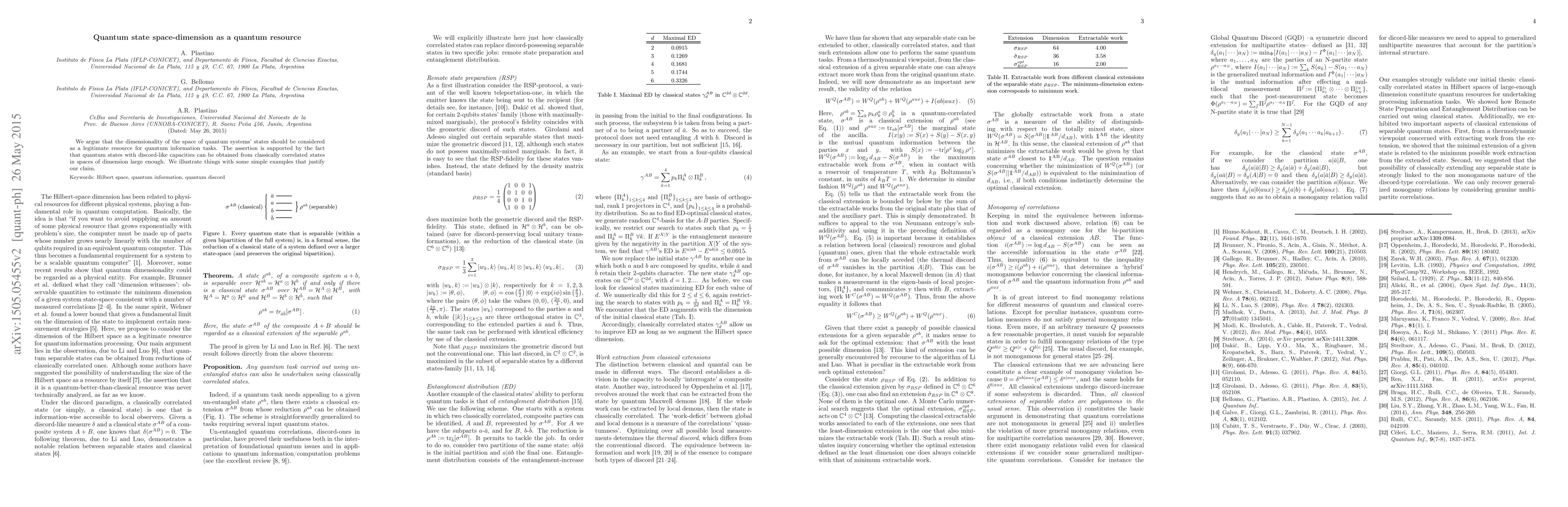 We argue that the dimensionality of the space of quantum systems' states should be considered as a legitimate resource for quantum information tasks. The assertion is supported by the fact that quantum states with discord-like capacities can be obtained from classically correlated states in spaces of dimension large enough. We illustrate things with some simple examples that justify our claim.