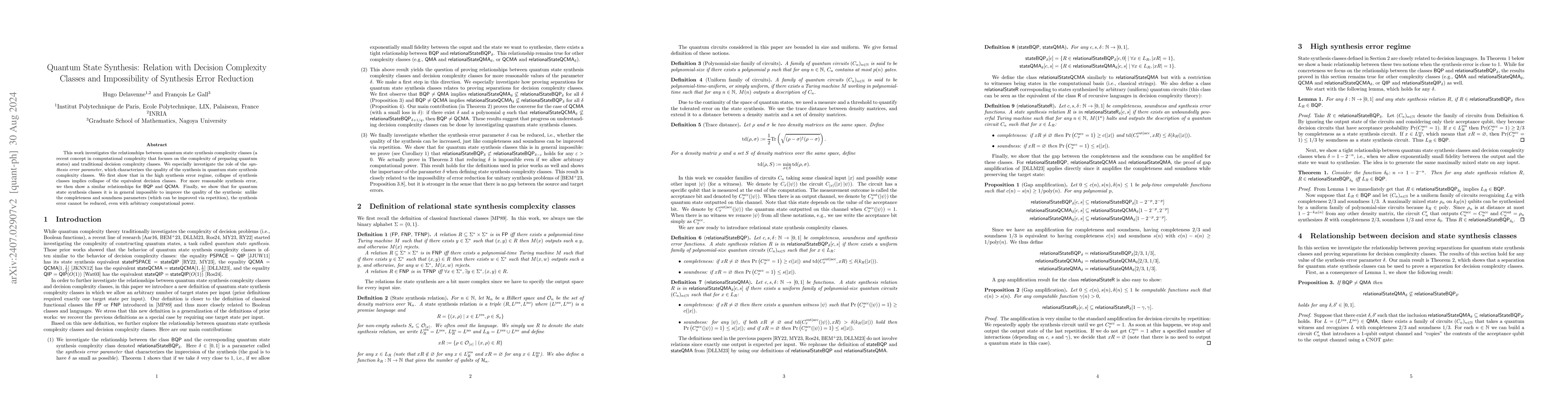 This paper explores the connections between quantum state synthesis complexity classes and traditional decision complexity classes, demonstrating that synthesis error cannot be reduced even with unlimited computational resources, unlike completeness and soundness parameters. It shows that synthesis class collapses correlate with collapses in equivalent decision classes under high synthesis error.