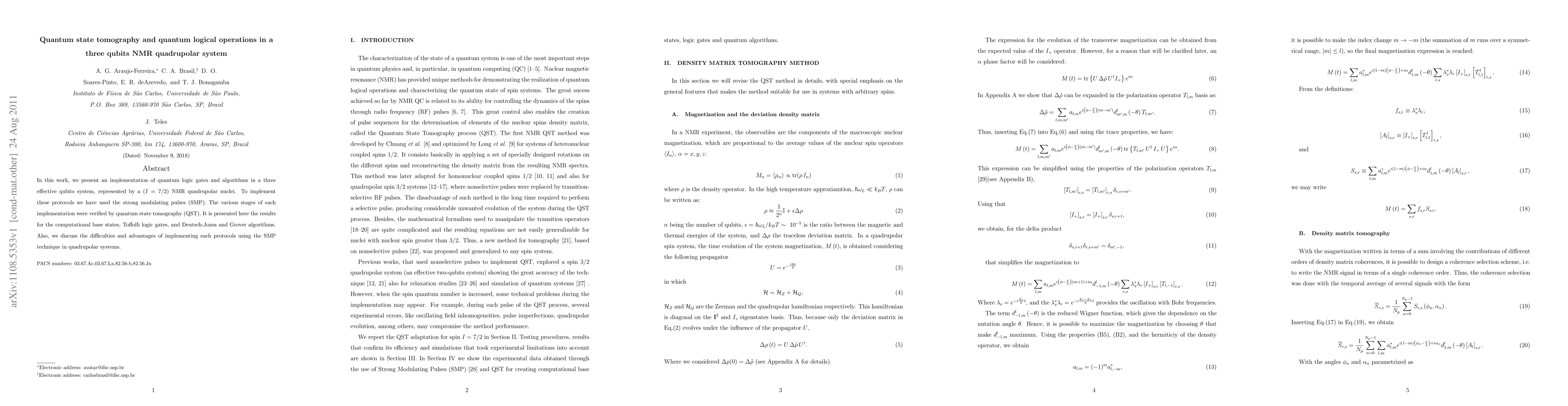 This paper details the implementation of quantum logic gates and algorithms in a three-qubit NMR quadrupolar system using strong modulating pulses, with verification through quantum state tomography. The study covers computational base states, Toffoli gates, and Deutsch-Jozsa and Grover algorithms, while also discussing the challenges and benefits of this technique.