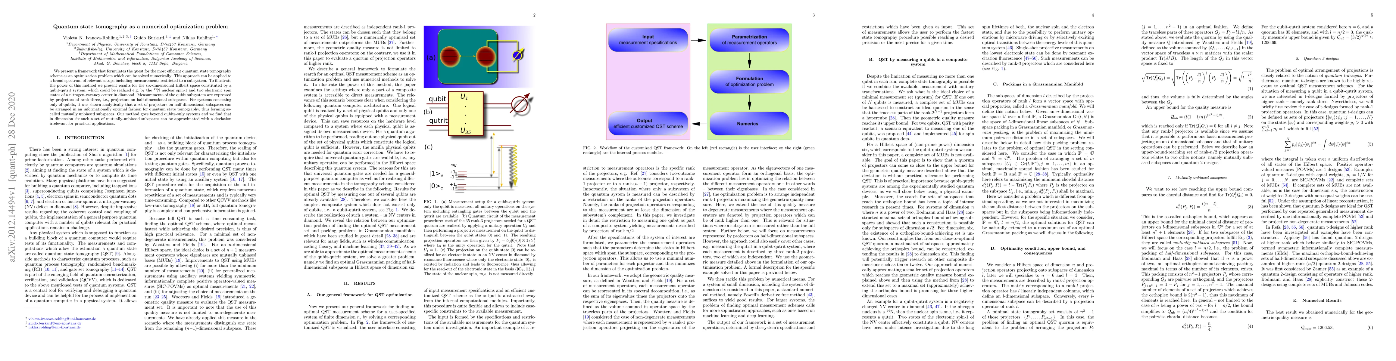 We present a framework that formulates the quest for the most efficient quantum state tomography scheme as an optimization problem which can be solved numerically. This approach can be applied to a broad spectrum of relevant setups including measurements restricted to a subsystem. To illustrate the power of this method we present results for the six-dimensional Hilbert space constituted by a qubit-qutrit system, which could be realized e.g. by the N-14 nuclear spin-1 and two electronic spin states of a nitrogen-vacancy center in diamond. Measurements of the qubit subsystem are expressed by projectors of rank three, i.e., projectors on half-dimensional subspaces. For systems consisting only of qubits, it was shown analytically that a set of projectors on half-dimensional subspaces can be arranged in an informationally optimal fashion for quantum state tomography, thus forming so-called mutually unbiased subspaces. Our method goes beyond qubits-only systems and we find that in dimension six such a set of mutually-unbiased subspaces can be approximated with a deviation irrelevant for practical applications.
