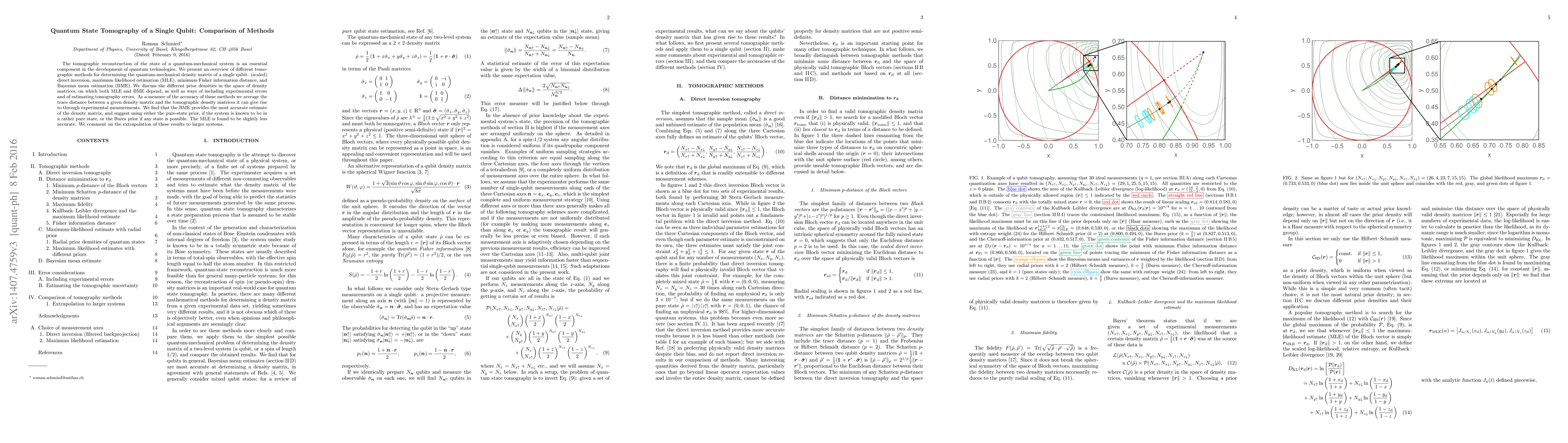 The tomographic reconstruction of the state of a quantum-mechanical system is an essential component in the development of quantum technologies. We present an overview of different tomographic methods for determining the quantum-mechanical density matrix of a single qubit: (scaled) direct inversion, maximum likelihood estimation (MLE), minimum Fisher information distance, and Bayesian mean estimation (BME). We discuss the different prior densities in the space of density matrices, on which both MLE and BME depend, as well as ways of including experimental errors and of estimating tomography errors. As a measure of the accuracy of these methods we average the trace distance between a given density matrix and the tomographic density matrices it can give rise to through experimental measurements. We find that the BME provides the most accurate estimate of the density matrix, and suggest using either the pure-state prior, if the system is known to be in a rather pure state, or the Bures prior if any state is possible. The MLE is found to be slightly less accurate. We comment on the extrapolation of these results to larger systems.