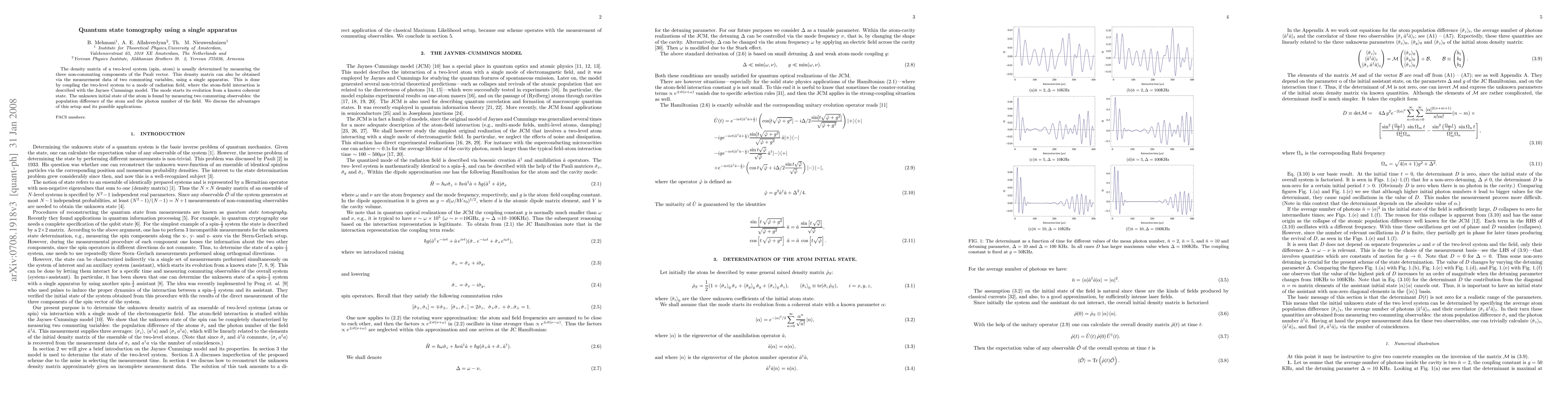 The research describes a method for quantum state tomography using a single apparatus by coupling a two-level system (atom) to a mode of a radiation field, described by the Jaynes-Cummings model. The unknown initial state of the atom is determined by measuring two commuting observables: the population difference of the atom and the photon number of the field.