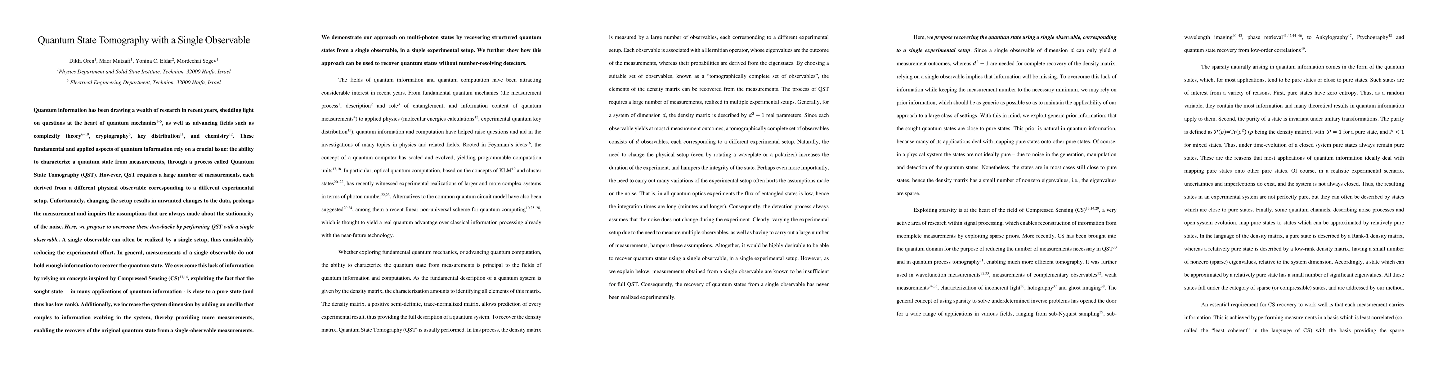This paper proposes a novel method for Quantum State Tomography (QST) using a single observable, significantly reducing experimental effort. By leveraging Compressed Sensing and coupling an ancilla system, the method recovers the original quantum state from limited single-observable measurements, demonstrating its effectiveness on multi-photon states and applicability without number-resolving detectors.