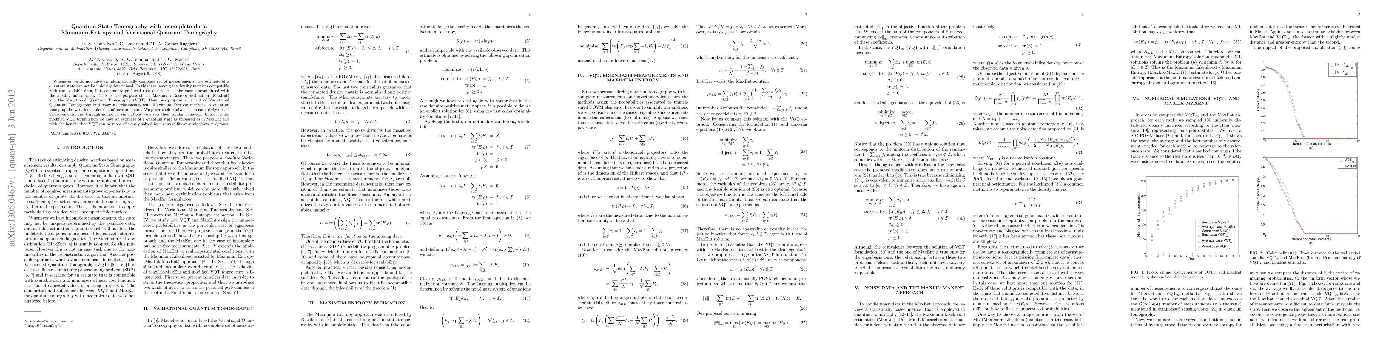 This paper explores quantum state tomography with incomplete measurement data, proposing a variant of Variational Quantum Tomography (VQT) and demonstrating its equivalence to Maximum Entropy (MaxEnt) methods under eigenbasis measurements. It highlights the efficiency of VQT over MaxEnt through linear semidefinite programs.