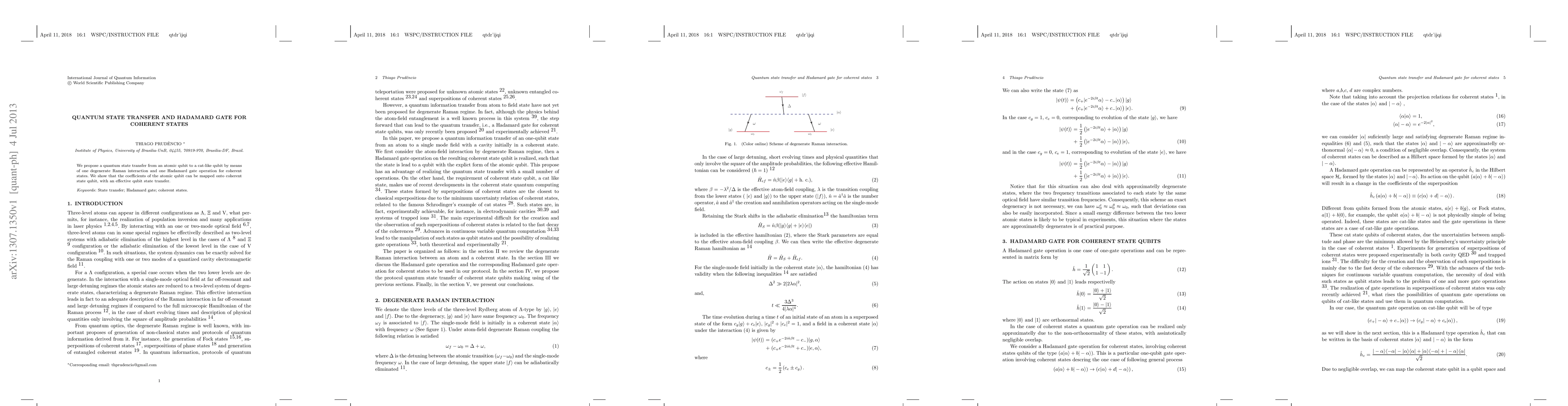Summary: This paper proposes a quantum state transfer method using a degenerate Raman interaction and a Hadamard gate to map atomic qubit coefficients onto coherent state qubits, achieving effective qubit state transfer. The technique is demonstrated for coherent states.