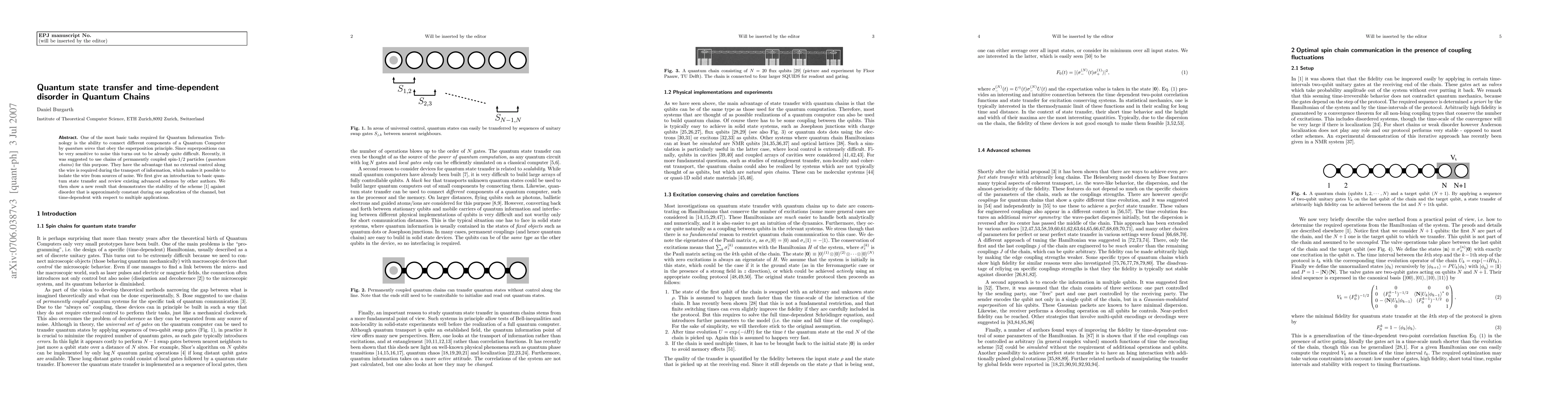 One of the most basic tasks required for Quantum Information Technology is the ability to connect different components of a Quantum Computer by quantum wires that obey the superposition principle. Since superpositions can be very sensitive to noise this turns out to be already quite difficult. Recently, it was suggested to use chains of permanently coupled spin-1/2 particles (quantum chains) for this purpose. They have the advantage that no external control along the wire is required during the transport of information, which makes it possible to isolate the wire from sources of noise. We first give an introduction to basic quantum state transfer and review existing advanced schemes by other authors. We then show a new result that demonstrates the stability of the scheme [1] against disorder that is approximately constant during one application of the channel, but time-dependent with respect to multiple applications.