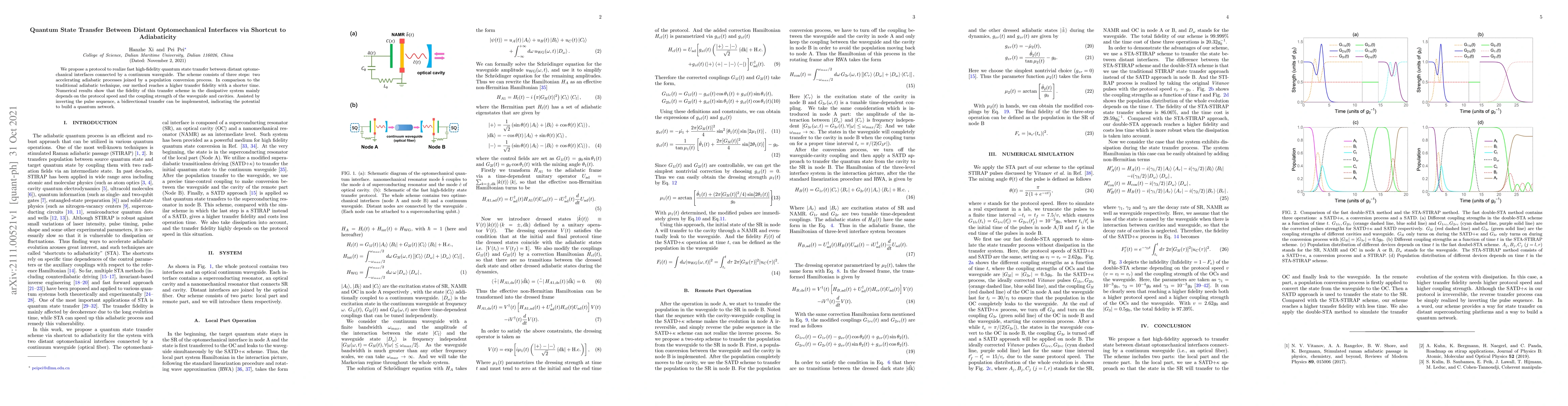 This paper proposes a protocol for high-fidelity quantum state transfer between distant optomechanical interfaces using a shortcut to adiabaticity, achieving higher fidelity in shorter time compared to traditional methods. The scheme involves two adiabatic processes and a population conversion, with fidelity dependent on speed and coupling strength, and allows bidirectional transfer via pulse sequence inversion.