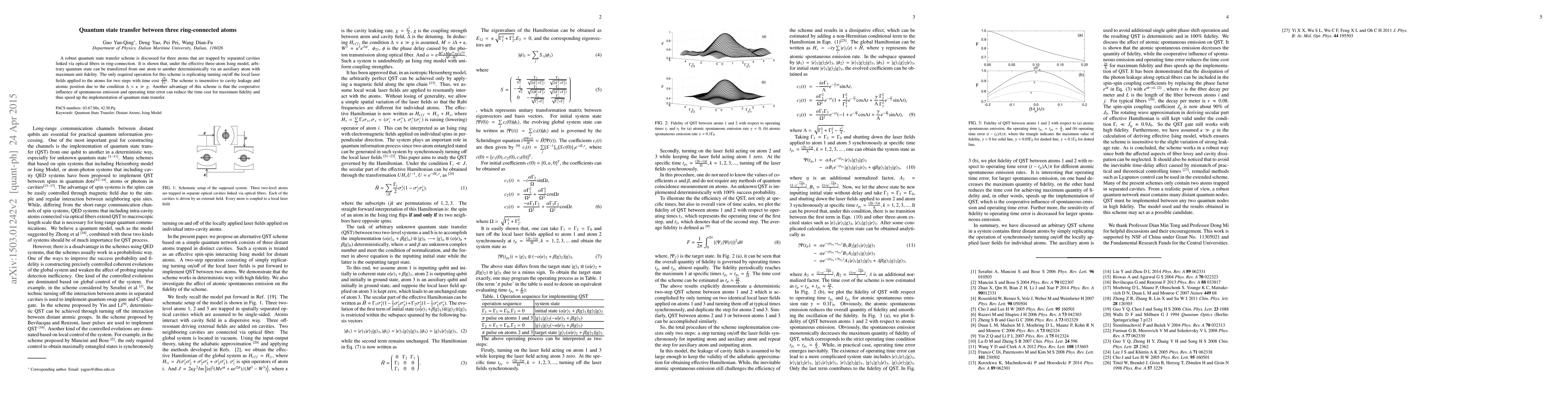 Researchers have developed a method for transferring quantum states between three atoms connected in a ring using optical fibers, with minimal required operations and high fidelity. The scheme can also withstand cavity leakage and atomic position errors, making it a promising step towards fast and reliable quantum state transfer.