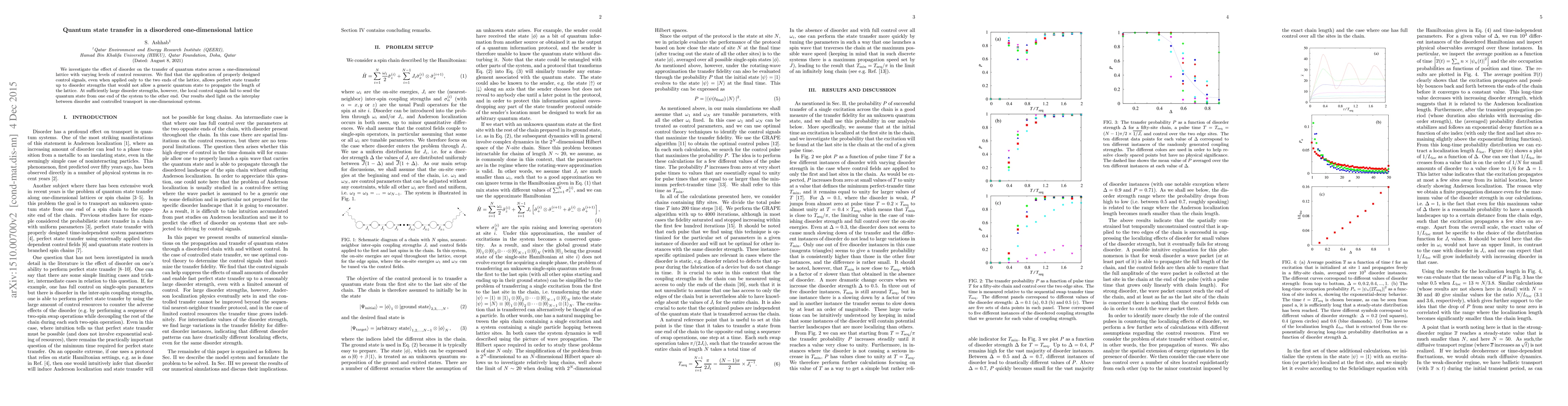 Researchers found that adding control signals to a disordered one-dimensional lattice can enable perfect quantum state transfer across long distances, even in systems with high disorder levels. However, at very strong disorder, the local control signals fail to send the quantum state.