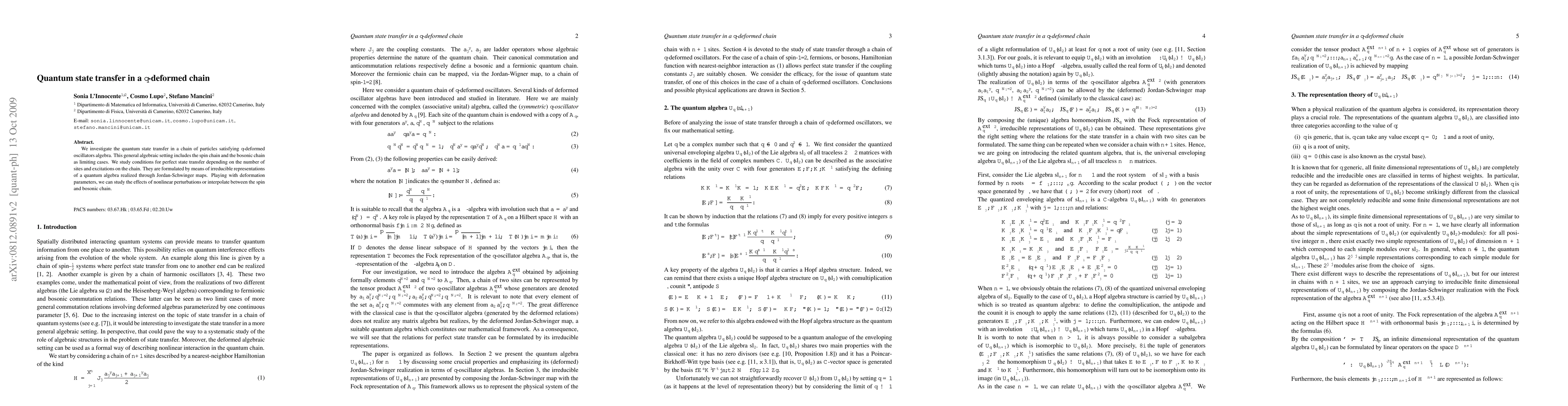 We investigate the quantum state transfer in a chain of particles satisfying q-deformed oscillators algebra. This general algebraic setting includes the spin chain and the bosonic chain as limiting cases. We study conditions for perfect state transfer depending on the number of sites and excitations on the chain. They are formulated by means of irreducible representations of a quantum algebra realized through Jordan-Schwinger maps. Playing with deformation parameters, we can study the effects of nonlinear perturbations or interpolate between the spin and bosonic chain.