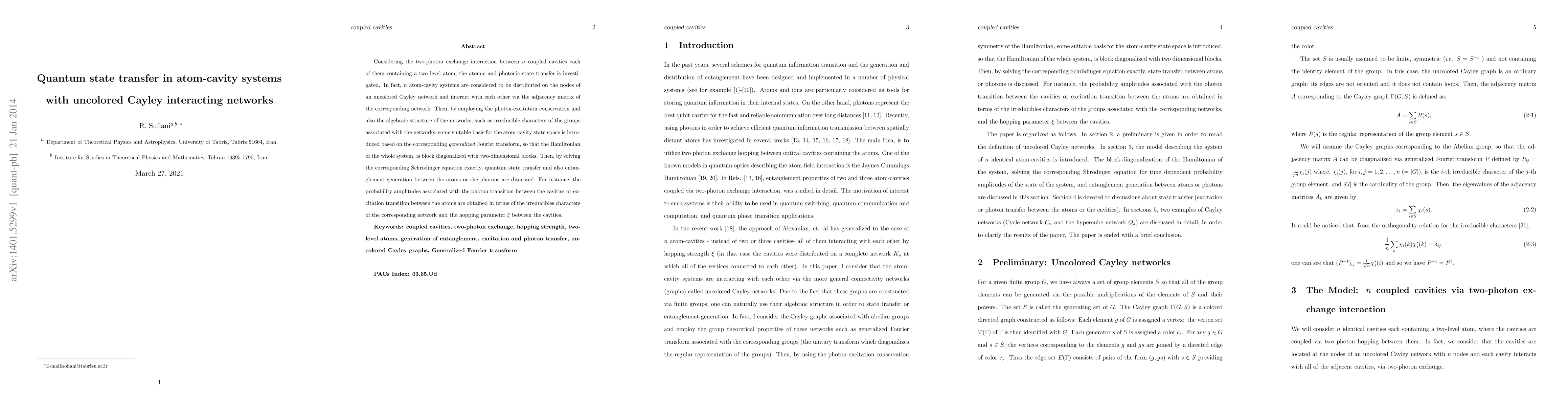 Considering the two-photon exchange interaction between n coupled cavities each of them containing a two level atom, the atomic and photonic state transfer is investigated. In fact, n atom-cavity systems are considered to be distributed on the nodes of an uncolored Cayley network and interact with each other via the adjacency matrix of the corresponding network. Then, by employing the photon-excitation conservation and also the algebraic structure of the networks, such as irreducible characters of the groups associated with the networks, some suitable basis for the atom-cavity state space is introduced based on the corresponding generalized Fourier transform, so that the Hamiltonian of the whole system, is block diagonalized with two-dimensional blocks. Then, by solving the corresponding Schrodinger equation exactly, quantum state transfer and also entanglement generation between the atoms or the photons are discussed. For instance, the probability amplitudes associated with the photon transition between the cavities or excitation transition between the atoms are obtained in terms of the irreducibles characters of the corresponding network and the hopping parameter ? between the cavities.