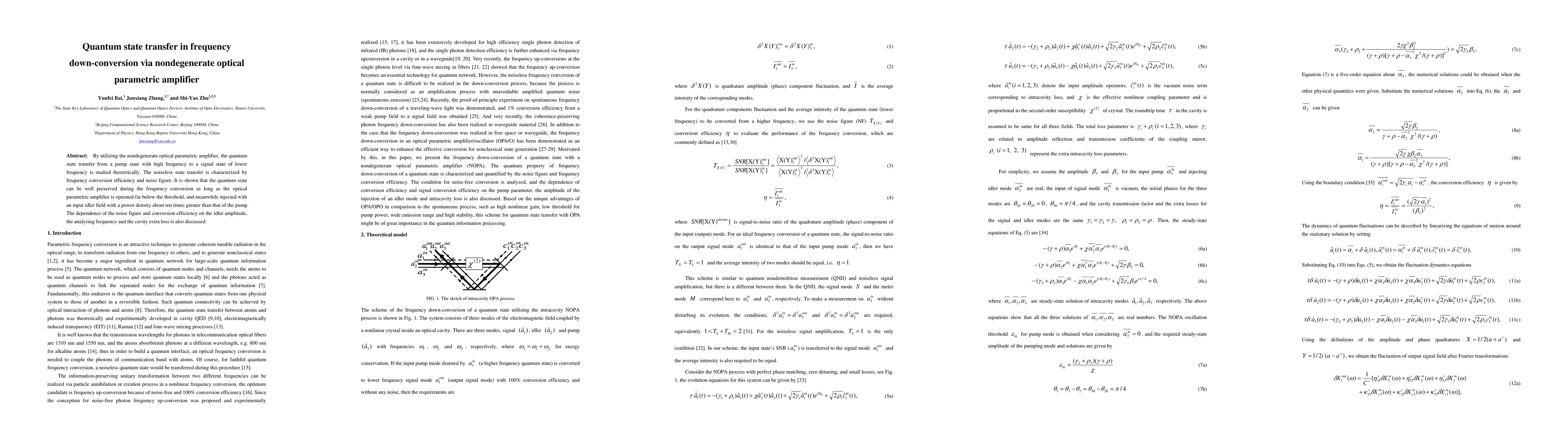 Theoretical study using nondegenerate optical parametric amplifier (NOPA) for quantum state transfer from high-frequency pump to low-frequency signal via frequency down-conversion.