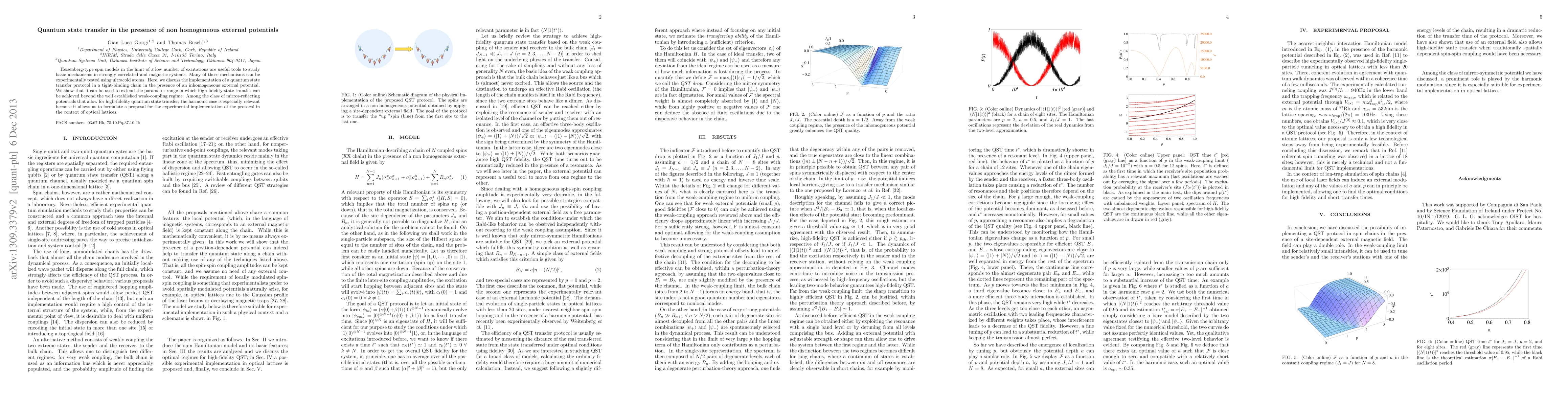 This paper explores quantum state transfer in Heisenberg-type spin models using ultracold atoms in a tight-binding chain under inhomogeneous external potentials, extending high fidelity transfer beyond the weak-coupling regime. The harmonic potential is highlighted for its relevance in experimental implementations using optical lattices.