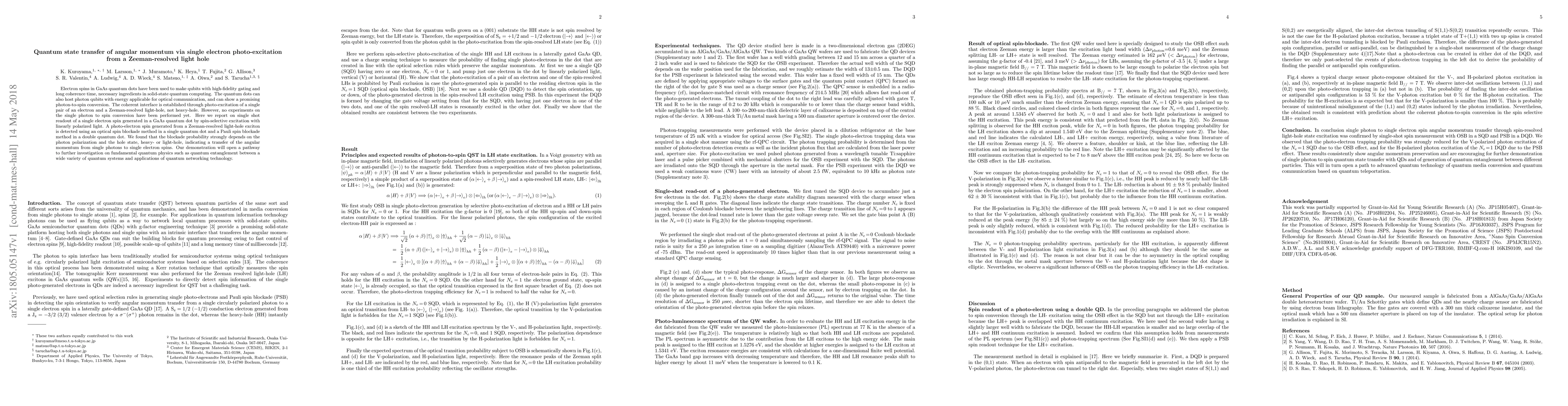 This paper reports on the quantum state transfer of angular momentum from single photons to electron spins in GaAs quantum dots via spin-selective excitation of Zeeman-resolved light-holes. The study demonstrates single shot readout of electron spin states using optical and Pauli spin blockade methods, indicating successful angular momentum transfer and paving the way for quantum entanglement and quantum networking.
