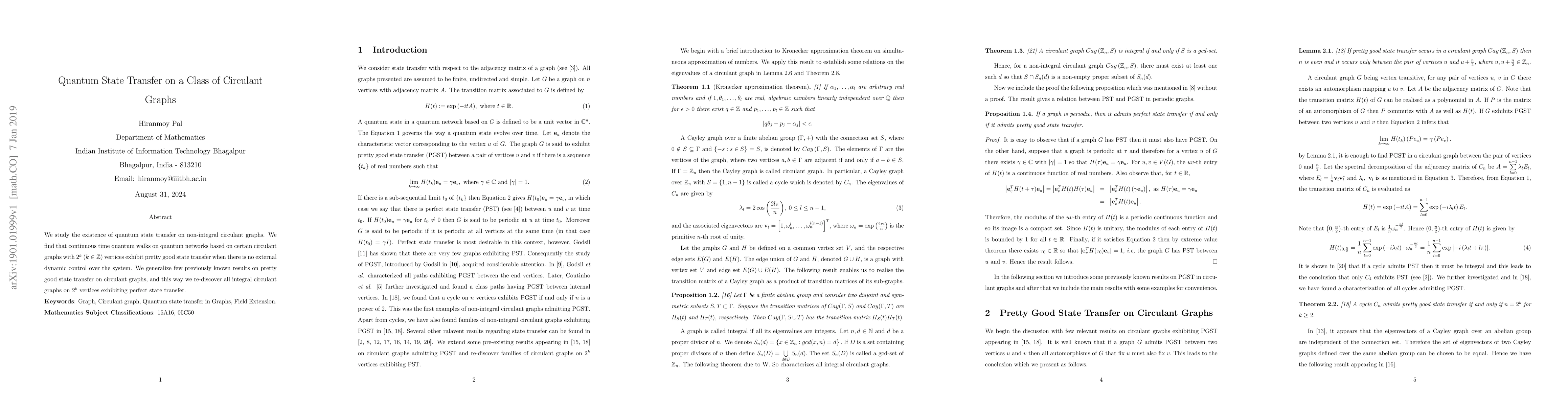 This paper investigates quantum state transfer on non-integral circulant graphs, finding that continuous time quantum walks on certain circulant graphs with $2^k$ vertices exhibit good state transfer without external control. It generalizes previous results, rediscovering all integral circulant graphs on $2^k$ vertices that show perfect state transfer.