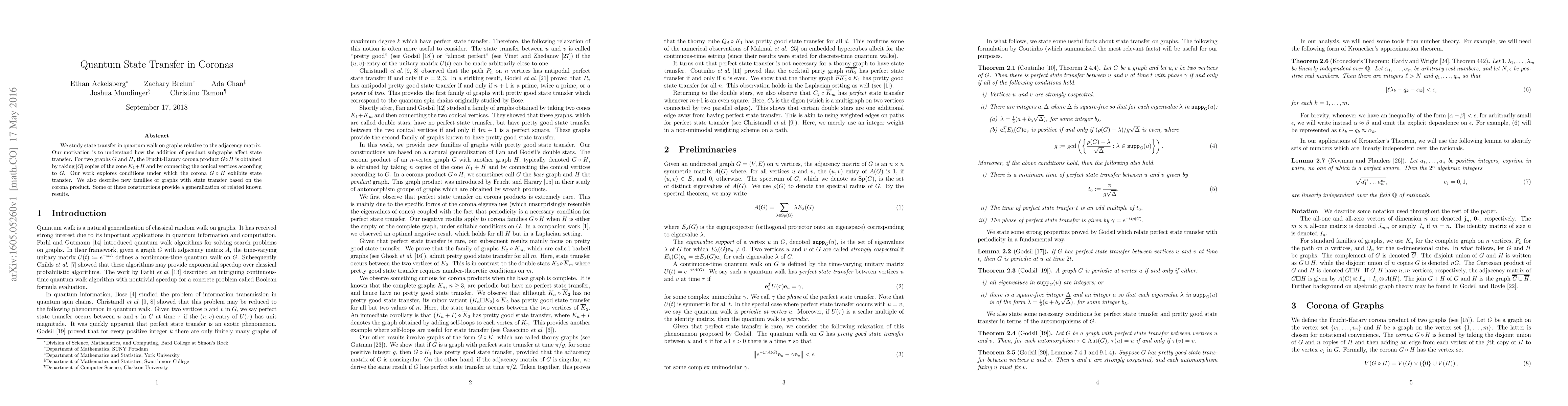 The paper introduces conditions for state transfer in corona graphs, extending previous work on distance-regular graphs and providing new families of graphs with state transfer.