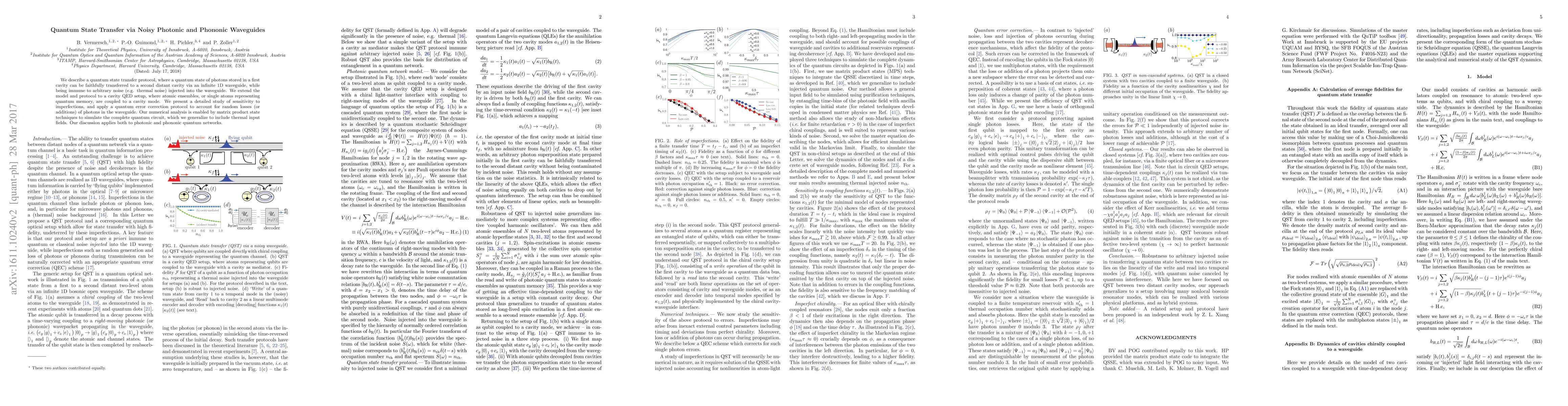 Researchers developed a quantum state transfer protocol that can transfer photons between two distant cavities through a noisy waveguide, while correcting for errors and thermal noise. The study applies to both photonic and phononic quantum networks.