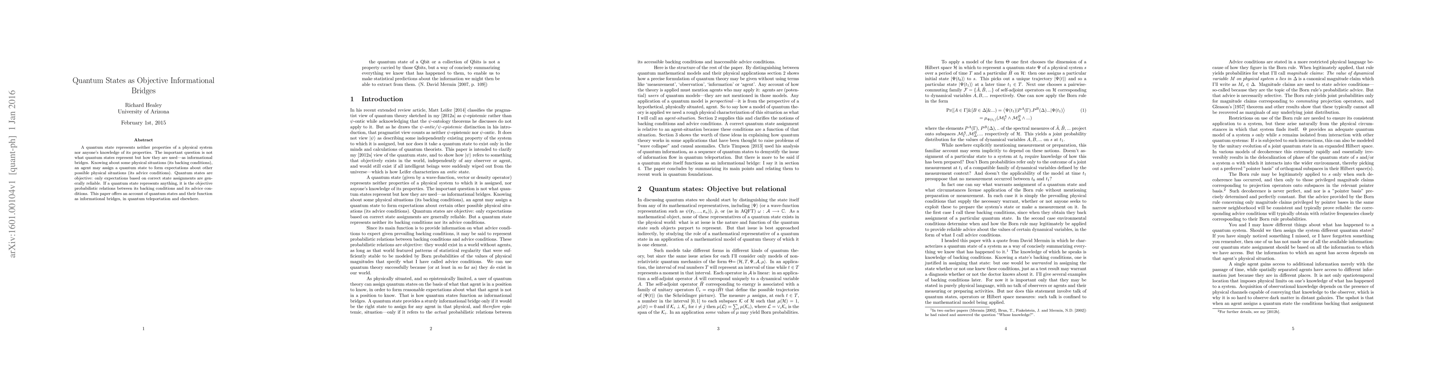This paper argues that quantum states function as objective informational bridges, representing probabilistic relations between backing and advice conditions, rather than properties of a physical system or knowledge about it. It emphasizes their role in forming reliable expectations in quantum teleportation and other contexts.