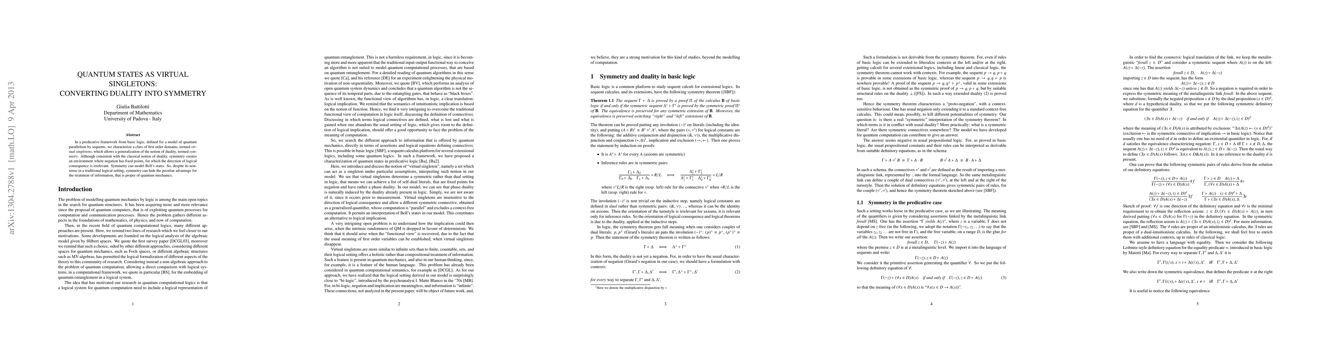 This paper introduces a new concept called symmetry in quantum mechanics, which allows for a generalization of duality and can model Bell's states. It proposes a framework that leverages virtual singletons to create an environment where negation has fixed points, providing an advantage in treating information.