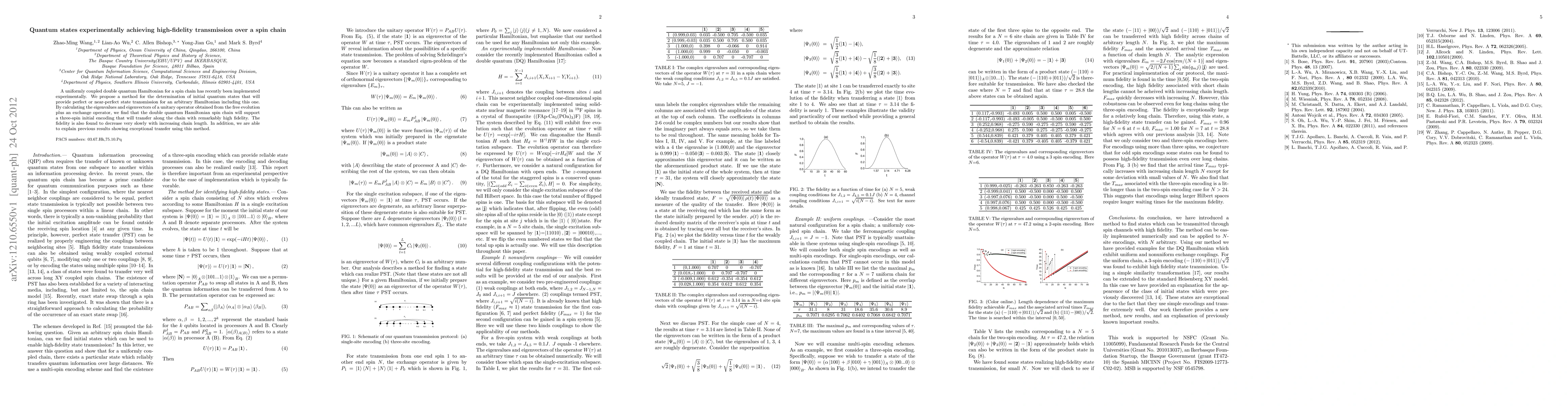 A uniformly coupled double quantum Hamiltonian for a spin chain has recently been implemented experimentally. We propose a method for the determination of initial quantum states that will provide perfect or near-perfect state transmission for an arbitrary Hamiltonian including this one. By calculating the eigenvalues and eigenvectors of a unitary operator obtained from the free evolution plus an exchange operator, we find that the double quantum Hamiltonian spin chain will support a three-spin initial encoding that will transfer along the chain with remarkably high fidelity. The fidelity is also found to decrease very slowly with increasing chain length. In addition, we are able to explain previous results showing exceptional transfer using this method.