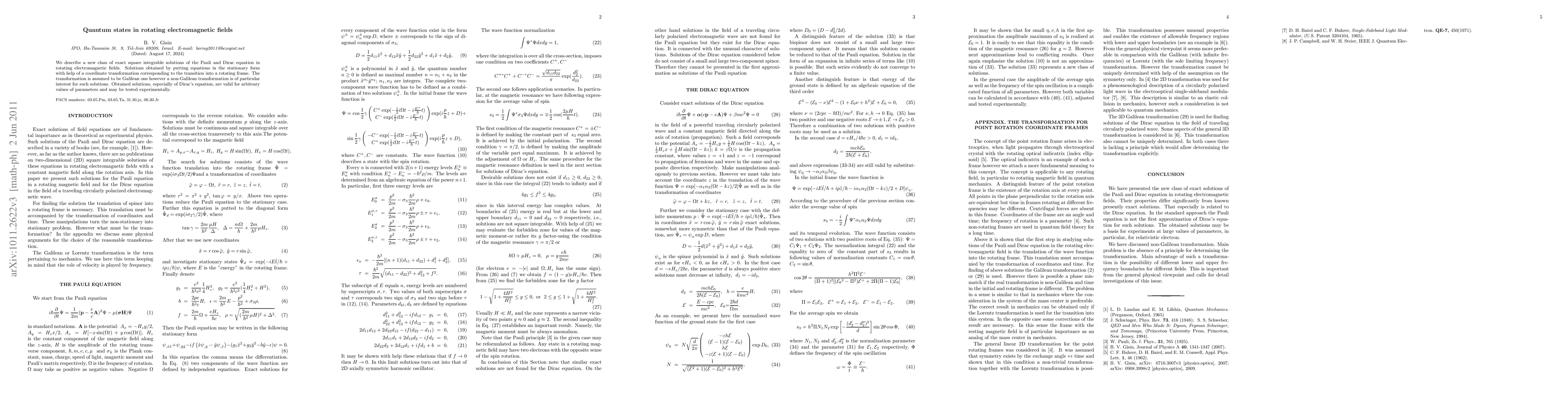 This paper presents exact square integrable solutions to the Pauli and Dirac equations in rotating electromagnetic fields, derived through a Galilean coordinate transformation. The solutions, particularly for Dirac's equation, are valid for any parameter values and hold potential for experimental verification.