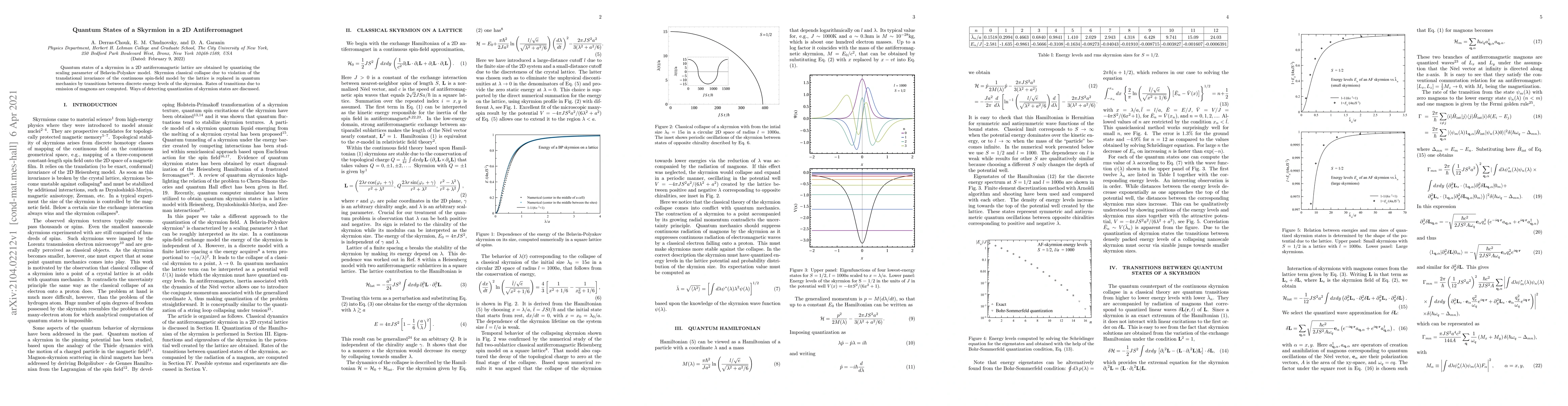 Researchers studied the quantum states of a skyrmion in a 2D antiferromagnetic lattice, finding that it transitions between discrete energy levels when quantized. They also calculated rates of transitions due to magnon emission and discussed ways to detect these transitions.