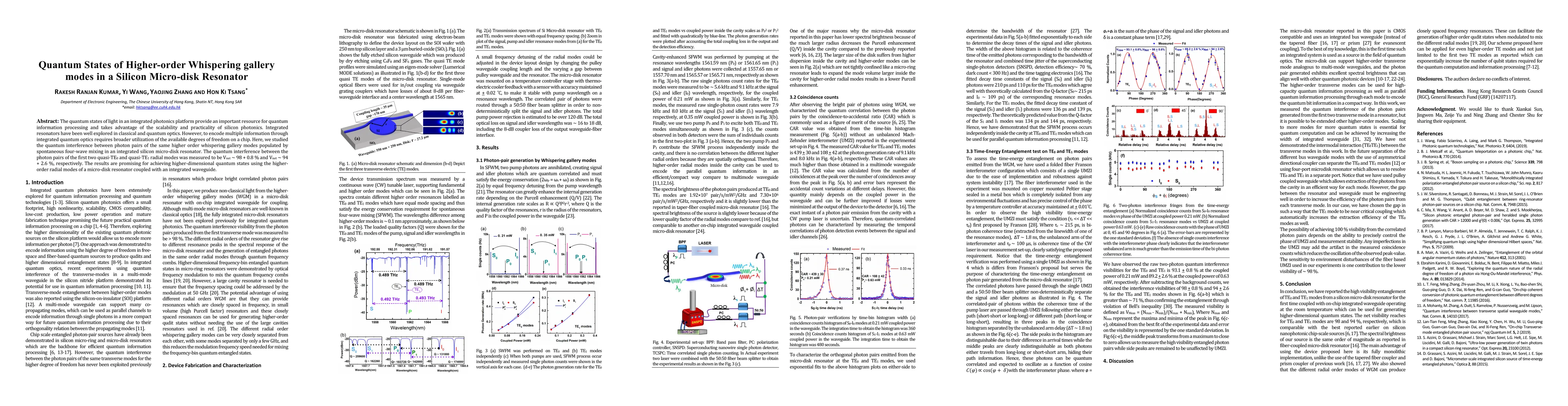 This paper explores quantum interference in photon pairs from higher-order whispering gallery modes in a silicon micro-disk resonator, achieving net visibilities of 98% and 94% for quasi-TE0 and quasi-TE1 modes, respectively. These results indicate potential for higher-dimensional quantum states in integrated photonics.