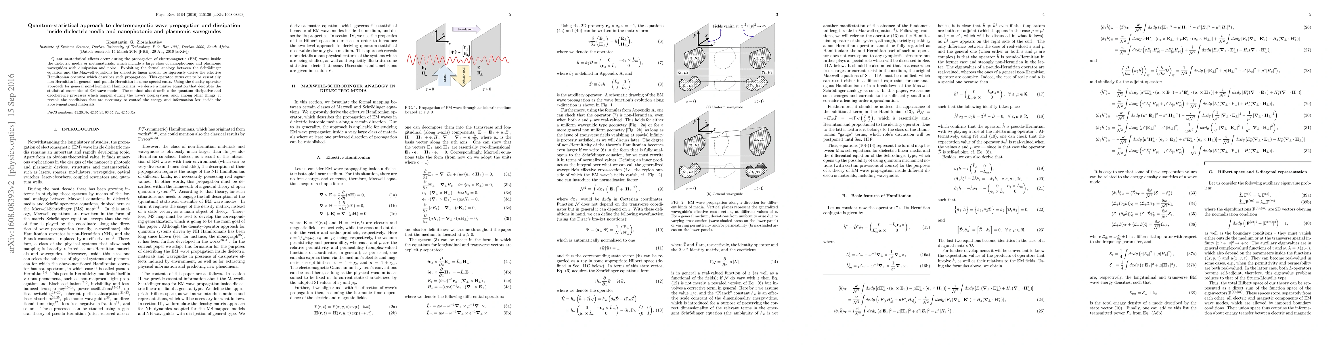 This paper develops a quantum-statistical framework for electromagnetic wave propagation and dissipation in dielectric media and nanophotonic waveguides, deriving an effective non-Hermitian Hamiltonian operator. It employs a density operator approach to describe the statistical ensembles of EM wave modes and the quantum dissipative processes, revealing conditions to control energy and information loss.