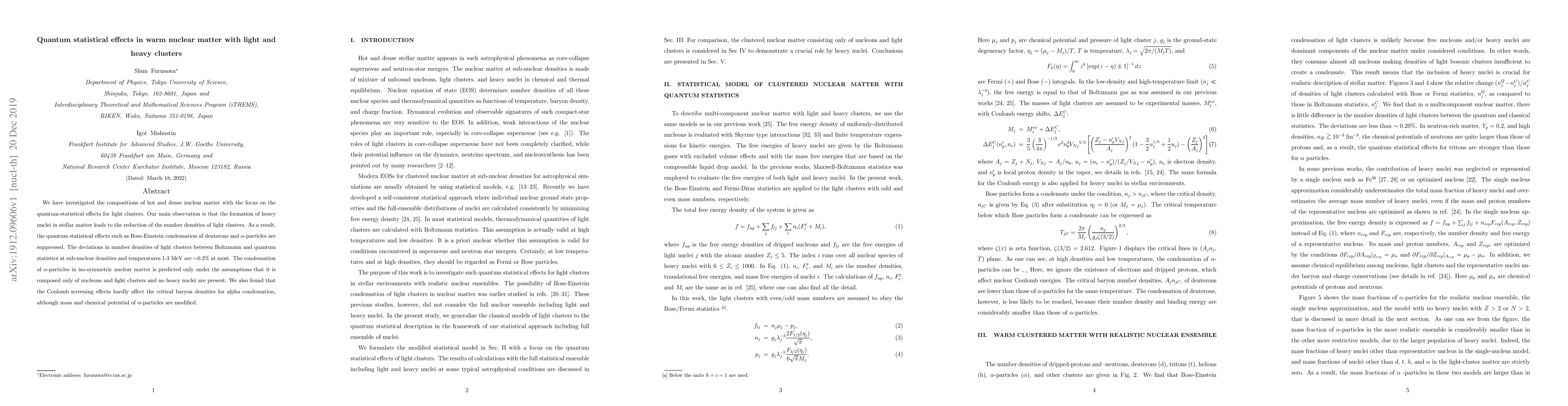 This paper investigates quantum-statistical effects in warm nuclear matter, finding that heavy nuclei formation reduces light cluster densities, suppressing Bose-Einstein condensation of deuterons and alpha particles. The study concludes that Coulomb screening has minimal impact on alpha condensation critical densities.