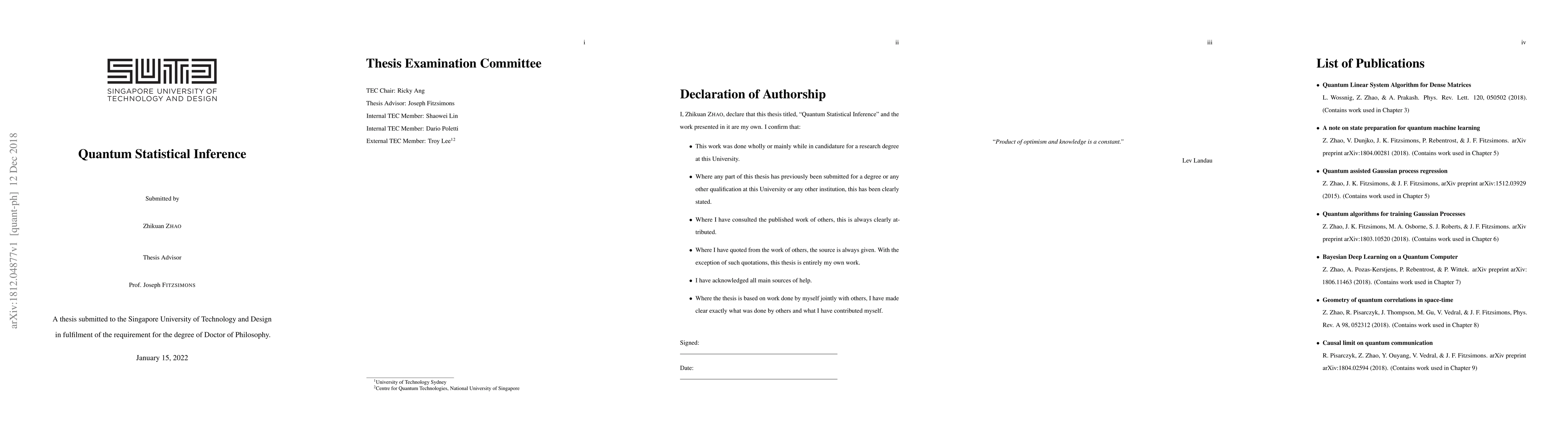 In this thesis, I present several results on quantum statistical inference in the following two directions. Firstly, I demonstrate that quantum algorithms can be applied to enhance the computing and training of Gaussian processes (GPs), a powerful model widely used in classical statistical inference and supervised machine learning. A crucial component of the quantum GP algorithm is solving linear systems with quantum computers, for which I present a novel algorithm that achieves a provable advantage over previously known methods. I will also explicitly address the task of encoding the classical data into a quantum state for machine learning applications. I then apply the quantum enhanced GPs to Bayesian deep learning and present an experimental demonstration on contemporary hardware and simulators. Secondly, I look into the notion of quantum causality and apply it to inferring spatial and temporal quantum correlations, and present an analytical toolkit for causal inference in quantum data. I will also make the connection between causality and quantum communications, and present a general bound for the quantum capacity of noisy communication channels.