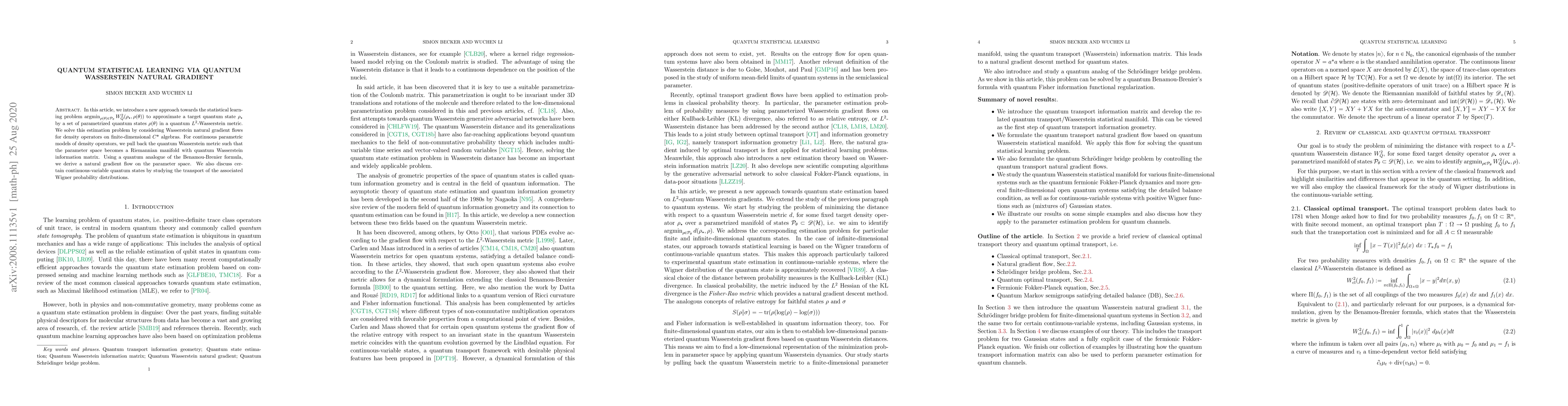 Researchers introduce a new approach to approximate target quantum states using Wasserstein natural gradient flows on parametrized quantum states, aiming to solve the statistical learning problem in quantum systems.