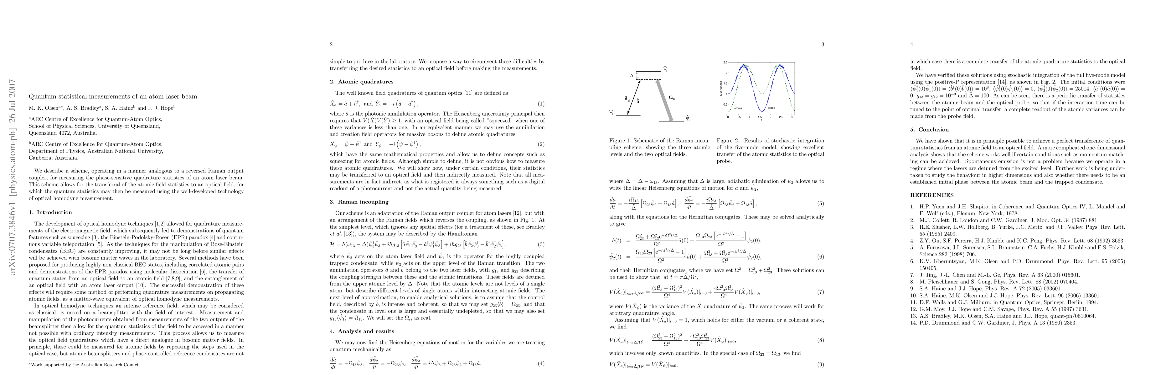 This paper proposes a method to measure the phase-sensitive quadrature statistics of an atom laser beam by transferring atomic field statistics to an optical field, enabling quantum statistics measurement via optical homodyne techniques. The scheme operates analogously to a reversed Raman output coupler.