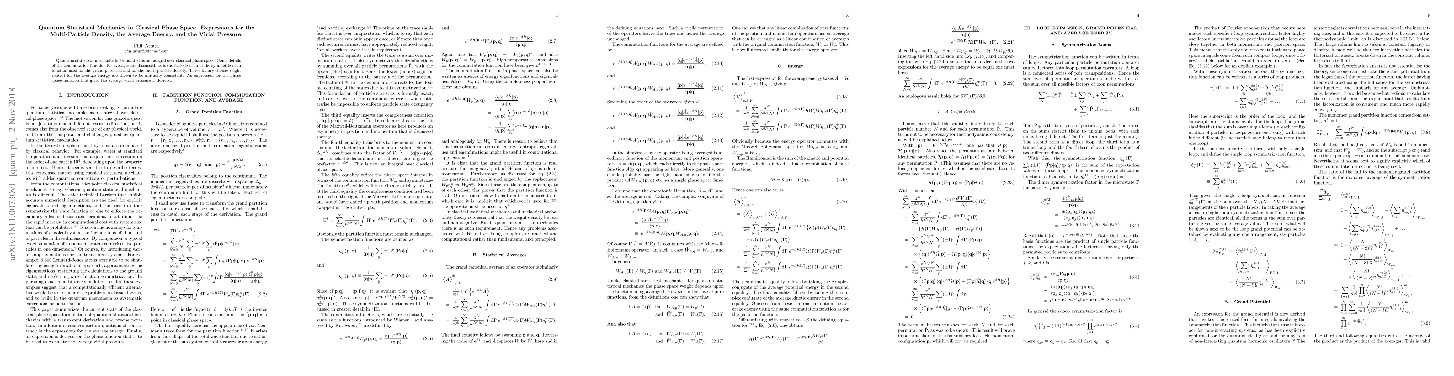 Quantum statistical mechanics is formulated as an integral over classical phase space. Some details of the commutation function for averages are discussed, as is the factorization of the symmetrization function used for the grand potential and for the multi-particle density. Three binary choices (eight routes) for the average energy are shown to be mutually consistent. An expression for the phase space function that gives the average virial pressure is derived.