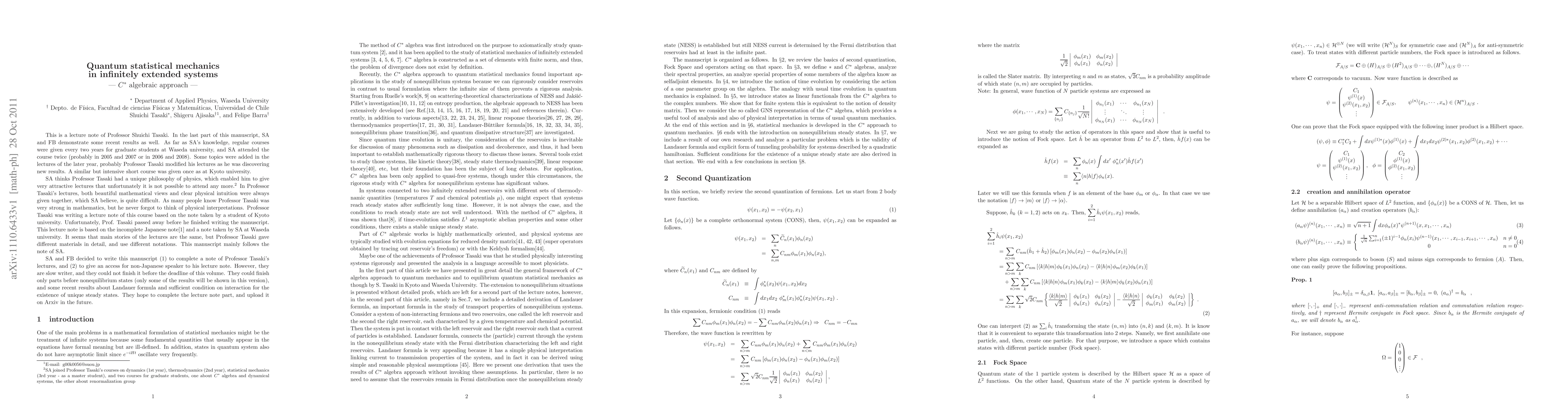 The derivation of macroscopic irreversible dynamics of nonequilibrium systems from microscopic equations was recently revisited from the point of view of infinitely extended quantum systems. Here we have briefly reviewed the $C^*$ algebra and its application to equilibrium systems as well as introduced some recent results on NESS. In addition, we have demonstrated the derivation of Landauer formula rigorously for quadratic systems but using a more physical presentation.