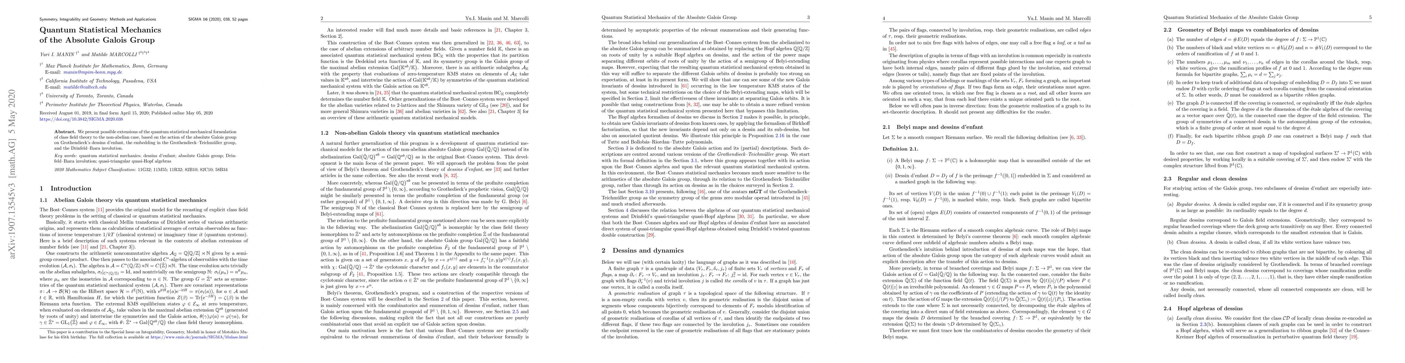 This paper explores quantum statistical mechanics extensions to class field theory, focusing on the absolute Galois group's action through Grothendieck's dessins d'enfant, embedding in the Grothendieck-Teichmüller group, and the Drinfeld-Ihara involution. The study aims to apply these quantum frameworks to non-abelian settings.