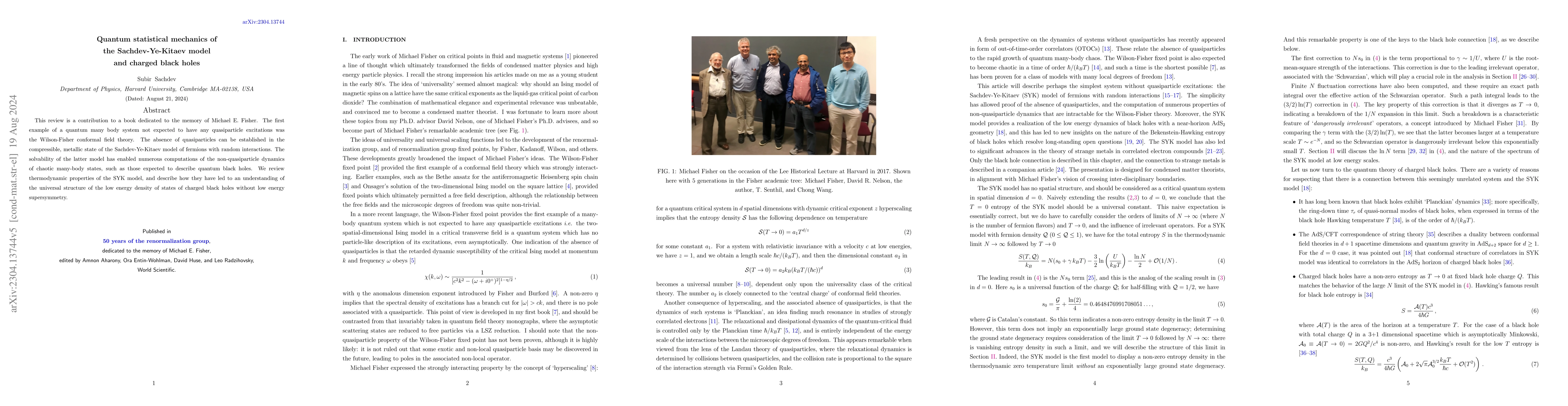 This review is a contribution to a book dedicated to the memory of Michael E. Fisher. The first example of a quantum many body system not expected to have any quasiparticle excitations was the Wilson-Fisher conformal field theory. The absence of quasiparticles can be established in the compressible, metallic state of the Sachdev-Ye-Kitaev model of fermions with random interactions. The solvability of the latter model has enabled numerous computations of the non-quasiparticle dynamics of chaotic many-body states, such as those expected to describe quantum black holes. We review thermodynamic properties of the SYK model, and describe how they have led to an understanding of the universal structure of the low energy density of states of charged black holes without low energy supersymmetry.