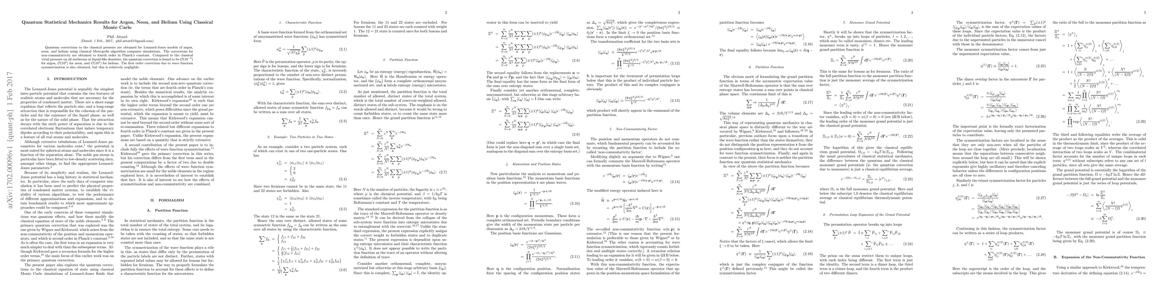 Quantum corrections to the classical pressure are obtained for Lennard-Jones models of argon, neon, and helium using classical Metropolis algorithm computer simulations. The corrections for non-commutativity are obtained to fourth order in Planck's constant. Compared to the classical virial pressure on all isotherms at liquid-like densities, the quantum correction is found to be ${\cal O}(10^{-2})$ for argon, ${\cal O}(10^{0})$ for neon, and ${\cal O}(10^{3})$ for helium. The first order correction due to wave function symmetrization is also obtained, but this is relatively negligible.
