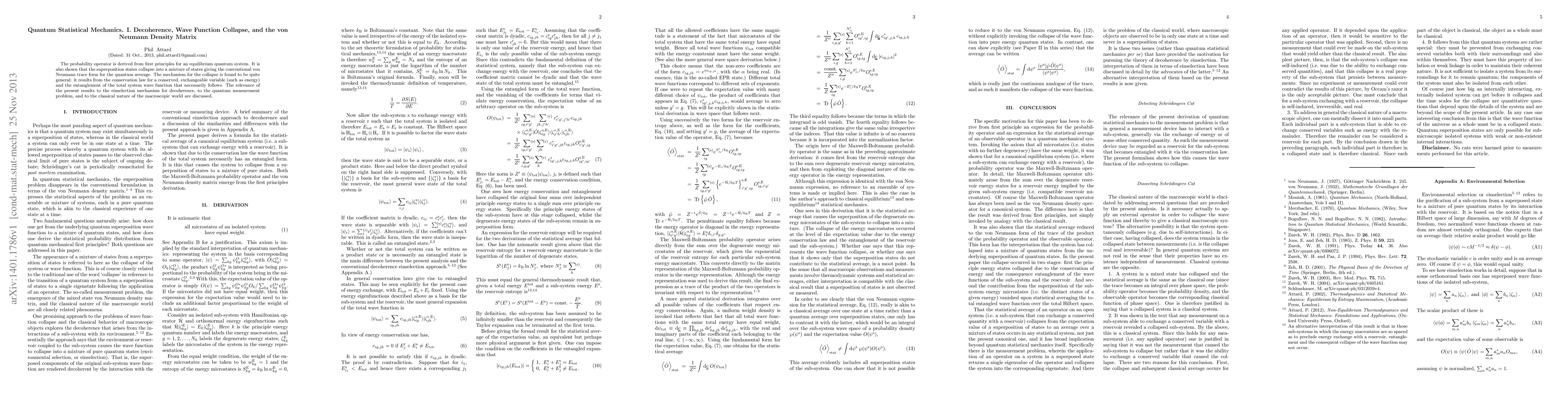 This paper derives the probability operator for equilibrium quantum systems and demonstrates how superposition states collapse into a mixture, leading to the von Neumann trace form. The collapse mechanism is attributed to the conservation of an exchangeable variable and the entanglement of the system wave function, with implications for decoherence, the quantum measurement problem, and the classical nature of macroscopic phenomena.