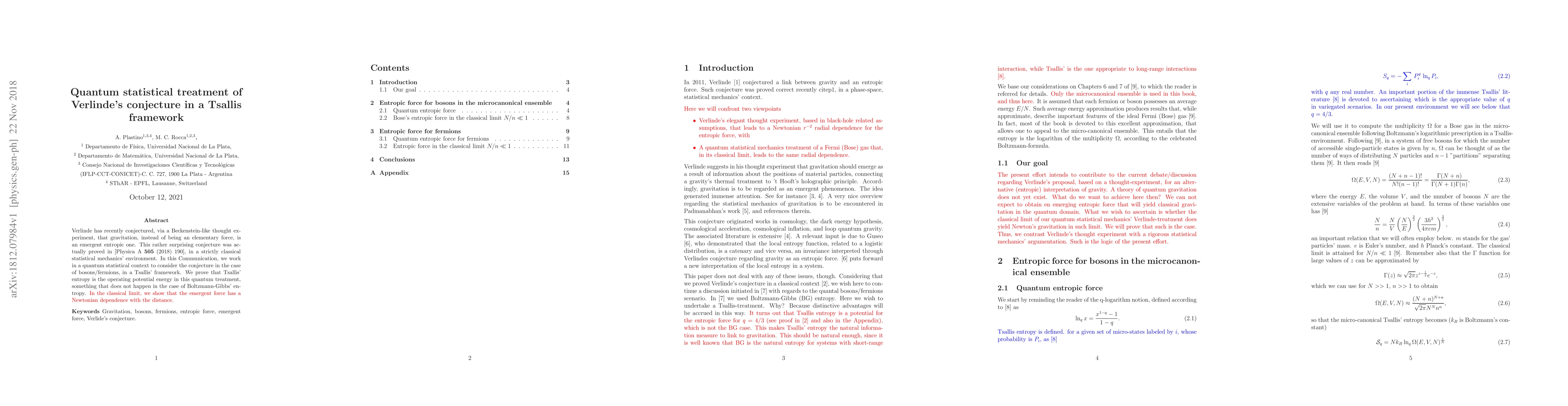 Verlinde has recently conjectured, via a Beckenstein-like thought experiment, that gravitation, instead of being an elementary force, is an emergent entropic one. This rather surprising conjecture was actually proved in [Physica A {\bf 505} (2018) 190], in a strictly classical statistical mechanics' environment. In this Communication, we work in a quantum statistical context to consider the conjecture in the case of bosons/fermions, in a Tsallis' framework. We prove that Tsallis' entropy is the operating potential energy in this quantum treatment, something that does not happen in the case of Boltzmann-Gibbs' entropy. \color{red} In the classical limit, we show that the emergent force has a Newtonian dependence with the distance.