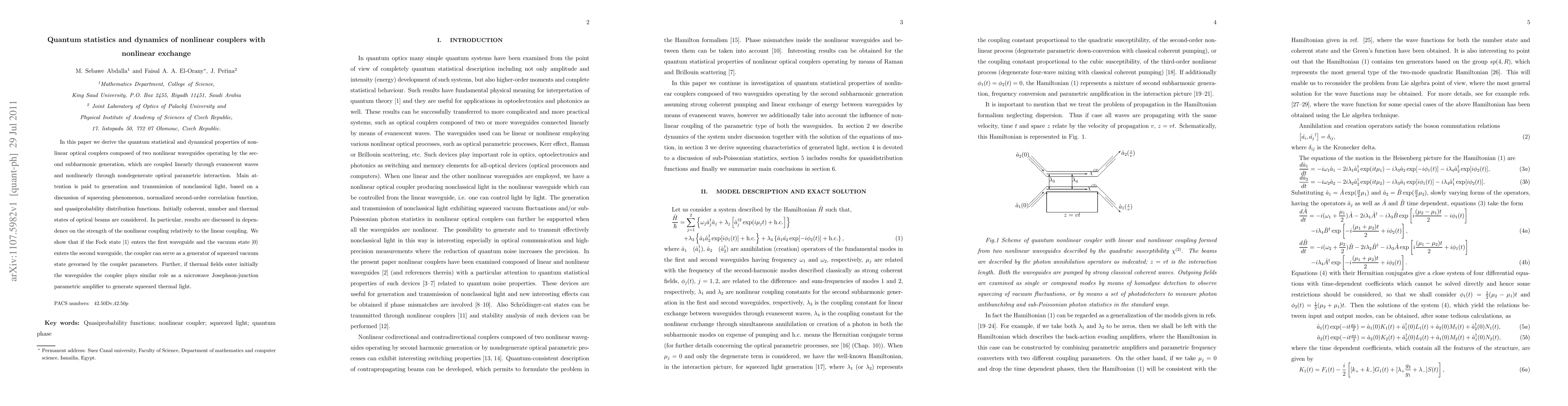 In this paper we derive the quantum statistical and dynamical properties of nonlinear optical couplers composed of two nonlinear waveguides operating by the second subharmonic generation, which are coupled linearly through evanescent waves and nonlinearly through nondegenerate optical parametric interaction. Main attention is paid to generation and transmission of nonclassical light, based on a discussion of squeezing phenomenon, normalized second-order correlation function, and quasiprobability distribution functions. Initially coherent, number and thermal states of optical beams are considered. In particular, results are discussed in dependence on the strength of the nonlinear coupling relatively to the linear coupling. We show that if the Fock state $|1>$ enters the first waveguide and the vacuum state $|0>$ enters the second waveguide, the coupler can serve as a generator of squeezed vacuum state governed by the coupler parameters. Further, if thermal fields enter initially the waveguides the coupler plays similar role as a microwave Josephson-junction parametric amplifier to generate squeezed thermal light.