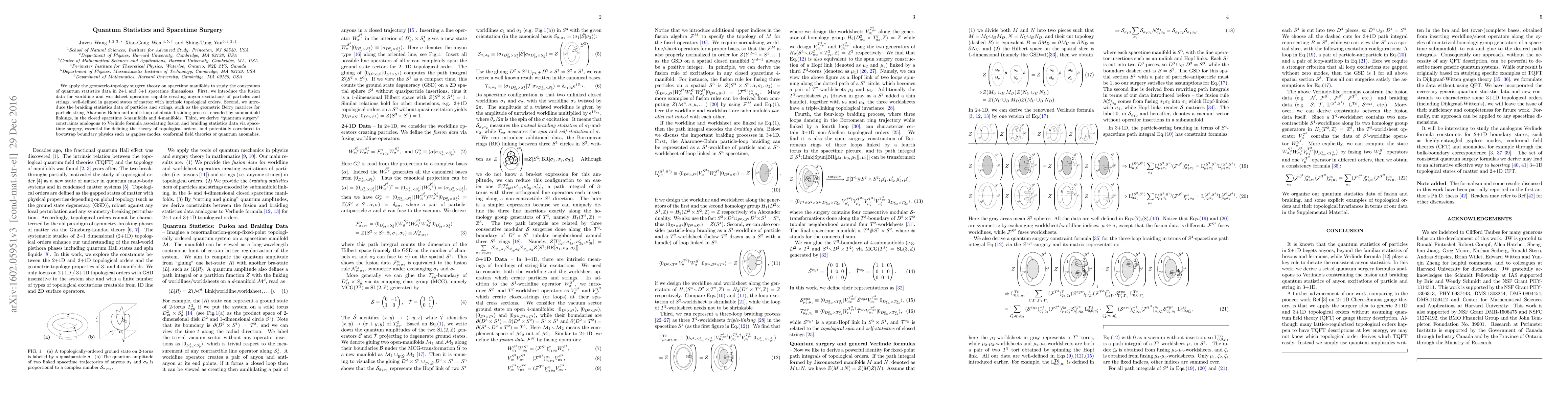 This paper applies surgery theory on spacetime manifolds to analyze quantum statistics data in 2+1 and 3+1 dimensions. It introduces fusion and braiding data for anyon excitations, deriving new quantum surgery constraints analogous to the Verlinde formula, crucial for topological order theories and potentially linked to boundary physics like gapless modes or quantum anomalies.